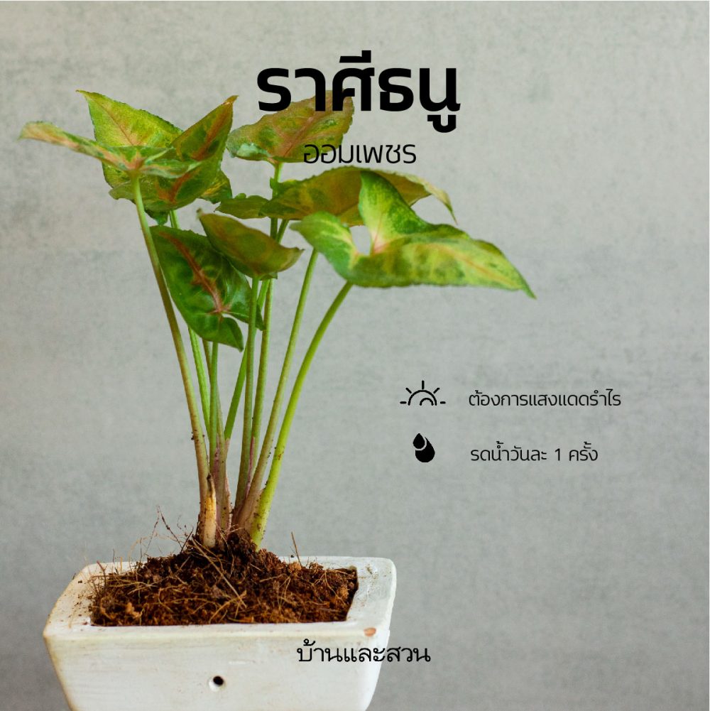 ชาวราศีธนู เป็นคนที่มีความเป็นผู้นำ ชอบเป็นที่ปรึกษาให้กับคนอื่น เพราะเป็นคนที่จิตใจดี เป็นมิตร ชอบให้ความช่วยเหลือ นอกจากนั้นยังเป็นคนใจบุญสุนทาน หาเงินเก่ง มีเงินหมุนเข้าออกตลอดเวลา จึงเหมาะกับ “ต้นออมเพชร” พืชที่อยู่ในวงศ์เดียวกับต้นบอน และมีความเชื่อกันว่าจะเป็นสิริมงคล มีเงินเหลือกินเหลือใช้ เสริมโชคด้านการเงิน