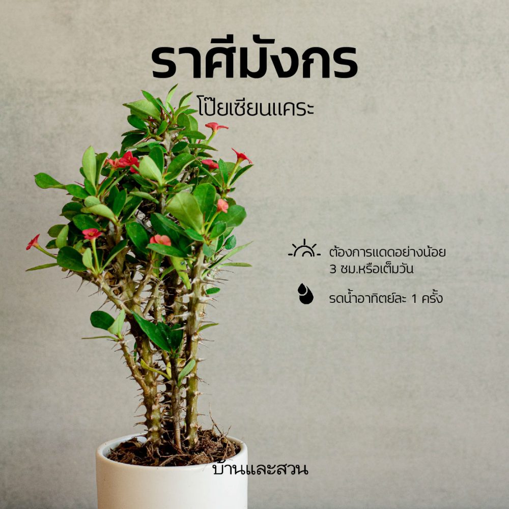 ชาวราศีมังกร เป็นคนค่อนข้างเป็นคนรอบคอบ ละเอียดอ่อน และมีความเข้มแข็งแกร่งกล้าแม้จะเป็นคนอ่อนไหวง่าย จึงเหมาะกับ “โป๊ยเซียนแคระ” ที่ลำต้นมีหนามอยู่รอบ แต่ต้องการคนละเมียดละไมมาดูแล ซึ่งโป๊ยเซียนถือเป็นไม้มงคลและเป็นไม้เสี่ยงทายในสมัยจีนโบราณ มีผู้ปลูกเป็นฮ่องเต้หรือพระราชวงศ์เท่านั้น ปัจจุบันหากปลูกครบ 8 ดอก จะหมายถึงเทพเจ้าหรือผู้วิเศษ 8 องค์ ทำให้มีโชคลาภและคุ้มครองให้เป็นสุขอีกด้วย