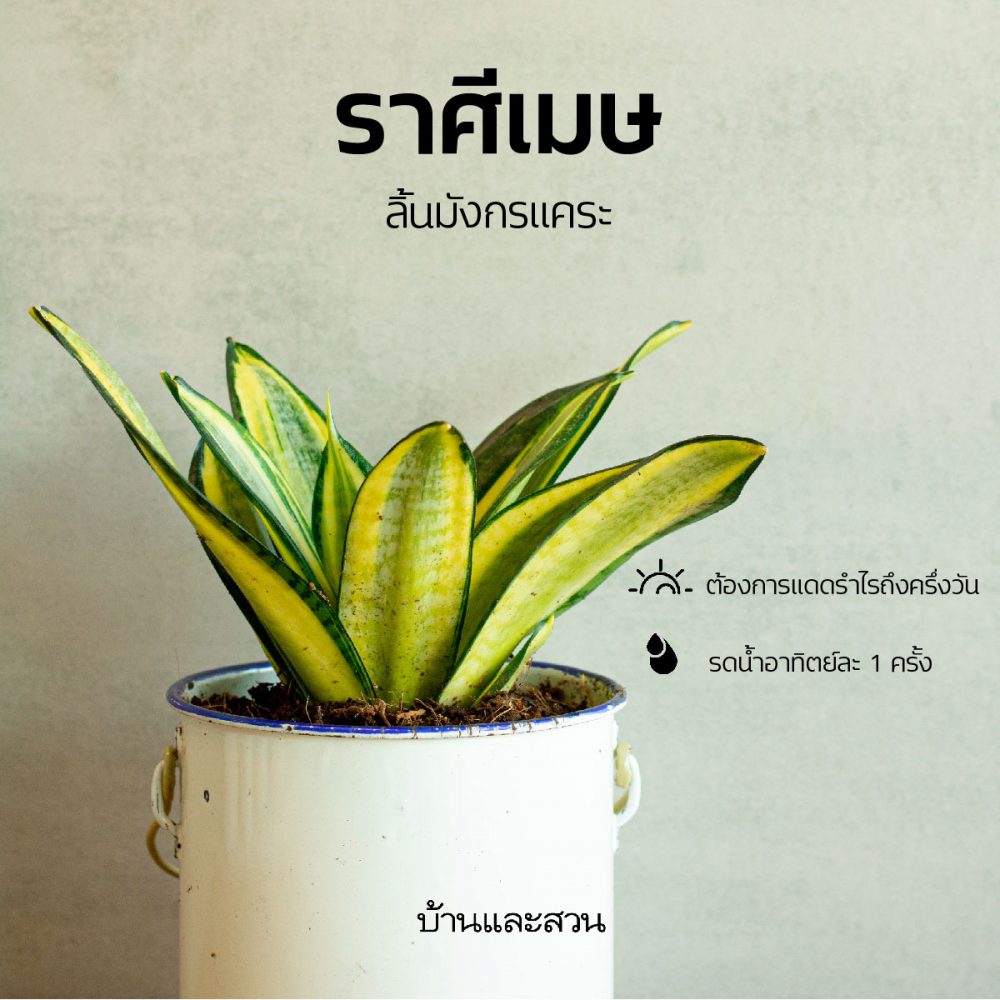 ชาวราศีเมษ เป็นผู้รักอิสระ ตัดสินใจอะไรฉับไว รักการผจญภัยและมักไขว่คว้าหาเรื่องแปลกใหม่ให้ชีวิตอยู่เสมอ เพราะความไม่ชอบอยู่นิ่ง จึงควรปลูกต้นไม้ที่ดูแลง่ายอย่าง “ลิ้นมังกรแคระ” ซึ่งมีความเชื่อกันว่าจะ่วยป้องกันภัยจากศัตรูได้