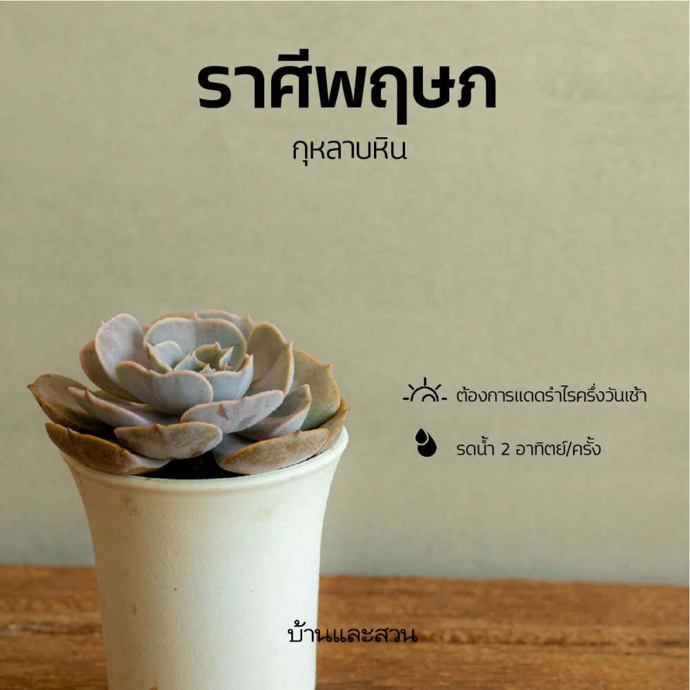 ชาวราศีพฤษภ เป็นผู้รักสวยรักงาม จัดการชีวิตอย่างมีระเบียบ ไม่ใจร้อน เหมาะกับ “กุหลาบหิน” ซึ่งในภาพเป็นพันธุ์ Echeveria peacockii Croucher กุหลาบหินมีลักษณะเหมือนกุหลาบที่มีความแข็งแรงเหมือนหิน มีความโดดเด่นด้านความสวยความงามทุกสายพันธุ์ สามารถดูดสารพิษในอากาศได้ และยังมีความเชื่อตามโหราศาสตร์อีกว่าหากปลูกต้นไม้นี้จะร่ำรวยเป็นเศรษฐี