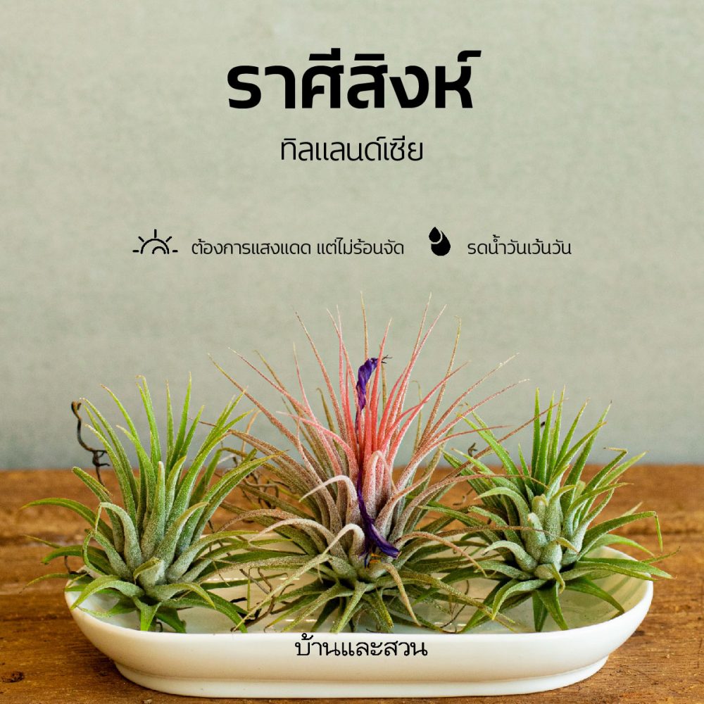 ชาวราศีสิงห์ เป็นคนที่มีบุคลิกกล้าหาญ กล้าได้กล้าเสีย รักเพื่อนรักฝูง มุมานะพากเพียร จะทำอะไรก็ต้องประสบความสำเร็จ จึงเหมาะกับ “ต้นทิลแลนด์เซีย” หรือเรียกอีกชื่อหนึ่งว่า สับปะรดอากาศ เป็นพืชที่อยู่วงศ์สับปะรด มีความเชื่อกันว่าต้นทิลแลนด์เซียจะช่วยทำให้ชีวิตประสบความสำเร็จ ราบรื่น ไม่มีอุปสรรคมาขัดขวาง