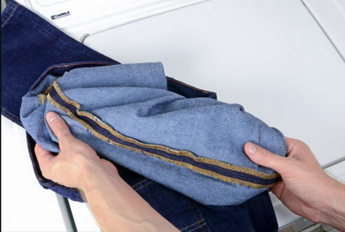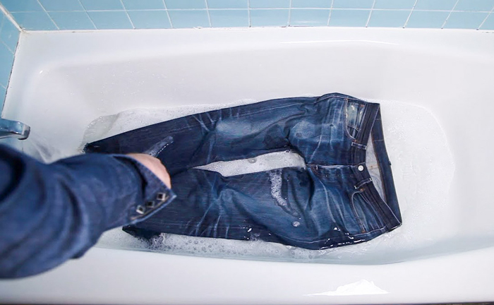 การซักกางเกงยีนส์โดยทั่วไป อาจต้องมีการพับ หรือม้วนบ้างเป็นธรรมดาในขณะแช่ ซึ่งถ้าหากกังวลว่าจะทำให้กางเกงยีนส์เสียทรง ก็ลองหันมาใช้วิธีการแช่ลงในอ่างน้ำ หรือพื้นที่ที่วางกางเกงยีนส์ทั้งตัวลงไปได้ เริ่มจากจัดกางเกงยีนส์ให้ได้ทรงเรียบร้อย และวางลงไปในอ่าง ที่มีน้ำสะอาดพร้อมกับหาขวด หรือภาชนะมาวางทับให้ทุกส่วนแช่อยู่ในน้ำ เมื่อผ่านไปสัก 30-45 นาที จึงจะเริ่มเติมน้ำยาซักผ้าอ่อน ๆ หรือส่วนผสมต่าง ๆ ที่ช่วยถนอมเนื้อผ้าลงไปเพื่อช่วยทำความสะอาดเพิ่มอีกแรง และก่อนจะนำไปตาก ให้วางกางเกงยีนส์ลงไปตรงกลางระหว่างผ้าขนหนู 2 ชั้น เพื่อช่วยซับน้ำออกให้ได้มากที่สุด ทีนี้กางเกงยีนส์ก็จะไม่อุ้มน้ำ และหนักเกินไปจนเสียทรง ที่สำคัญยังประหยัดเวลาในการตากมากขึ้นด้วย
