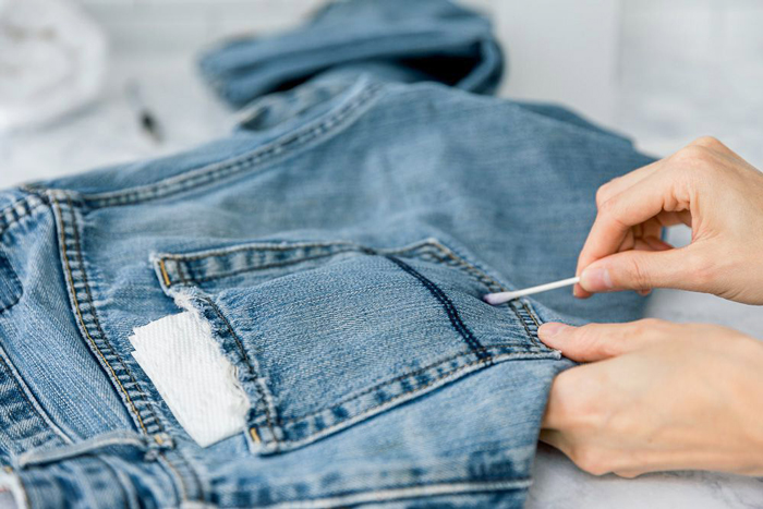 ยีนส์ก็ไม่ต่างจากผ้าทั่วไป ที่นอกจากเรื่องอับชื้นจากเหงื่อแล้ว ก็ยังเกิดคราบเลอะเฉพาะจุดได้เหมือนกัน ซึ่งบางครั้งถ้าเกิดคราบเพียงบริเวณเล็ก ๆ ก็อาจไม่จำเป็นต้องถึงขั้นนำไปแช่หรือซักก็ได้ เพราะสามารถใช้น้ำยาทำความสะอาด ที่ช่วยถนอมผ้ามาผสมกับน้ำให้เจือจางและค่อย ๆ ป้ายลงไปบนคราบเลอะแทนได้ หลังจากทิ้งไว้สักพักจึงค่อยใช้ผ้าชุบน้ำมาค่อย ๆ เช็ดออกให้คราบจางไป เท่านี้ก็ไม่ต้องเสียเวลาซัก และตากยีนส์โดยไม่จำเป็นแล้ว