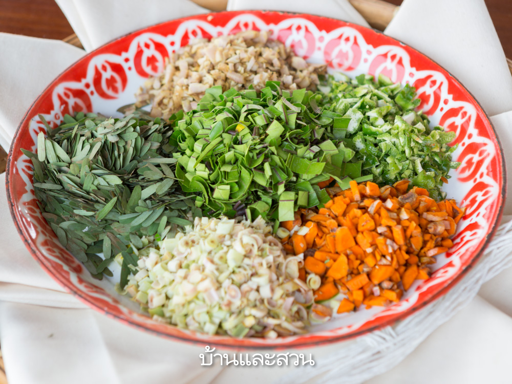 1.นําส่วนผสมทั้งหมดมาโขลกพอหยาบแล้วคลุกเคล้าให้เป็นเนื้อเดียวกัน