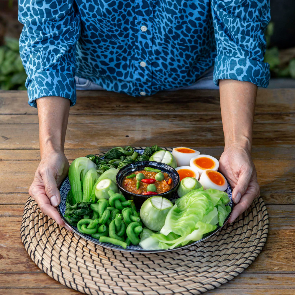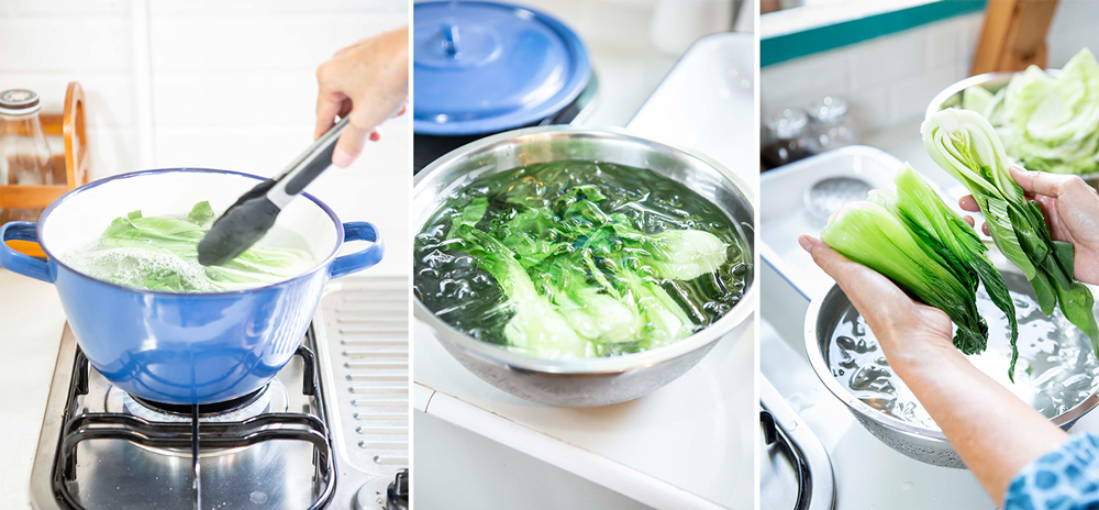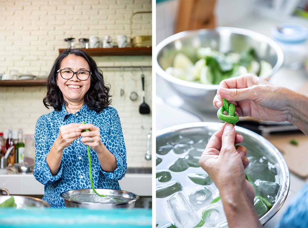 “ เทคนิคการลวกผักให้น่าทาน สีสด ไม่คล้ำ สิ่งแรกที่ต้องดูเลยคือน้ำ น้ำต้องเดือดด้วยอุณหภูมิคงที่ตลอดการต้ม อุปสรรคที่คนทำครัวไทยมักจะเจอลมที่พัดมาที่เตา ทำให้แก๊สไหว ส่งผลให้อุณหภูมิเปลี่ยนได้ น้ำที่ใช้ลวกผักเหยาะเกลือลงไปนิดหน่อย เกลือจะช่วยให้สีของผักสดเหมือนเดิม พอสังเกตว่าผักเริ่มสลดให้รีบตักขึ้นแล้วลงแช่น้ำเย็นจัดๆทันที อุณหภูมิที่เย็นจัดจะช่วยล็อกความสุกให้ได้ตามที่เราต้องการ ไม่ระอุเพิ่มจากนี้อีก ”