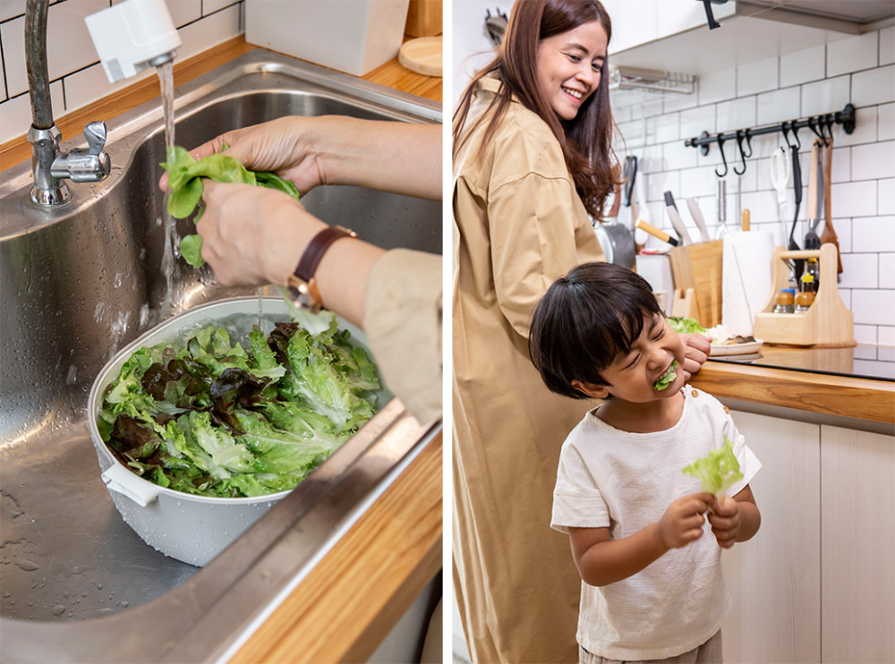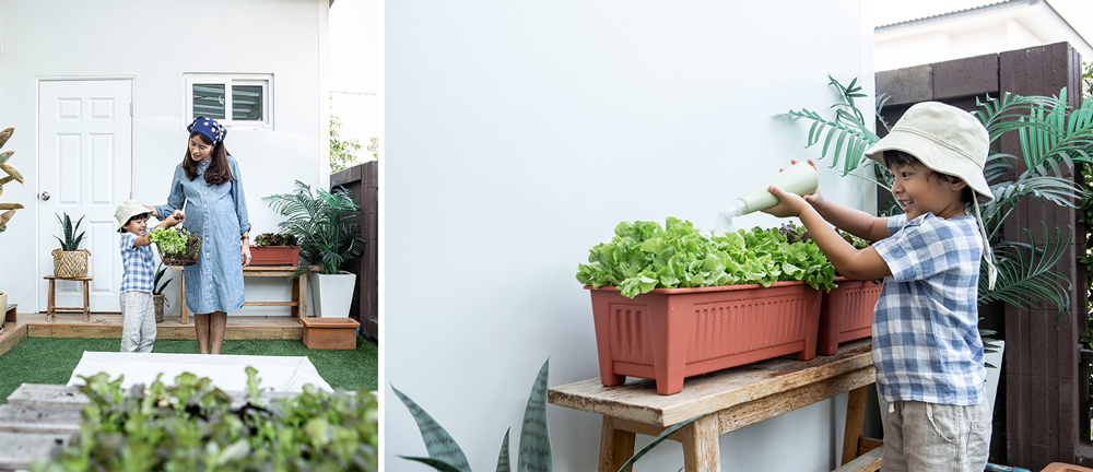 “ เหมือนเราเล่าเรื่องราวต่าง ๆ ให้เพื่อนฟัง เพราะโมสเที่ยวตั้งแต่ท้องจนคลอด และอยากถ่ายทอดเรื่องราวการคลอดแบบธรรมชาติ พอดีเราทำบ้านใหม่ ก็อยากจะแบ่งปันสิ่งที่เรารู้และคนน่าจะสนใจ เราอยู่กับลูกมาตั้งแต่เขาเกิด เลี้ยงเอง อยู่ด้วยกันทุกวัน หากิจกรรมทำด้วยกันตลอด พ่อ แม่ ลูก อย่างการปลูกผักสลัดนี่ก็แปลกใหม่กับเขา พอเขาลองทำมันก็ทำได้แล้วเขาก็ทำมันได้ดีด้วย ” เมื่อผลลัพธ์ของความใส่ใจ ตอบแทนกลับมาเป็นบรรยากาศน่ารัก ๆ ที่เติมใจให้ฟูด้วยรอยยิ้มและความสุขของผู้คนที่ใช้เวลาทุกนาทีไปด้วยกัน ก็หมดคำถามแล้วว่า บ้านที่ชอบเป็นแบบไหน เพราะคำตอบก็ต่างรอบตัวทุกครั้งที่ลืมตา