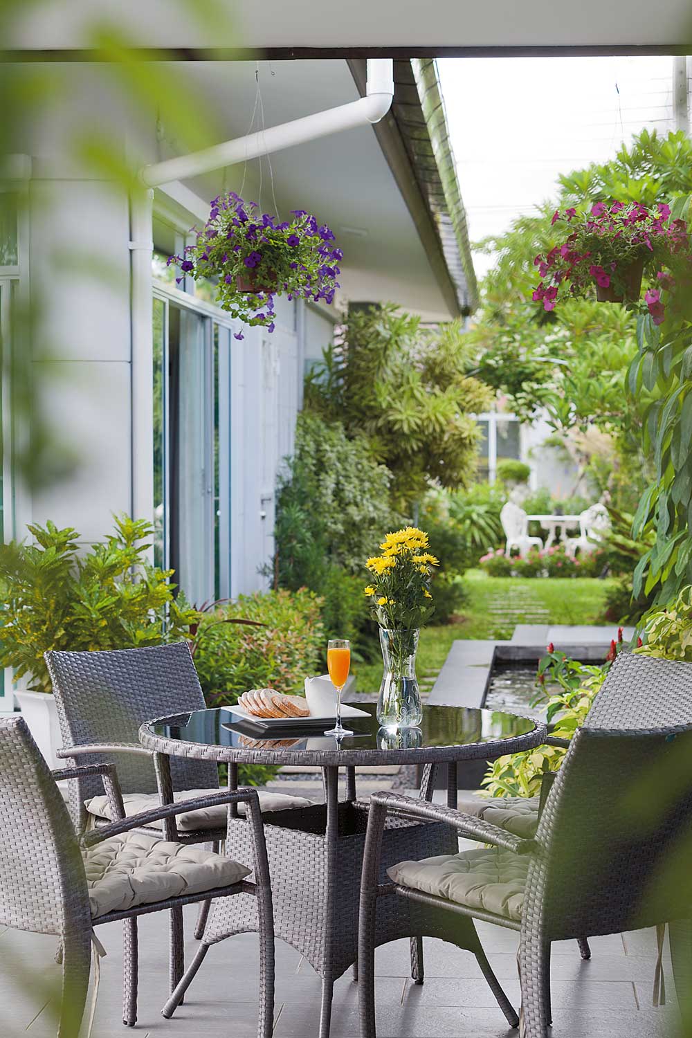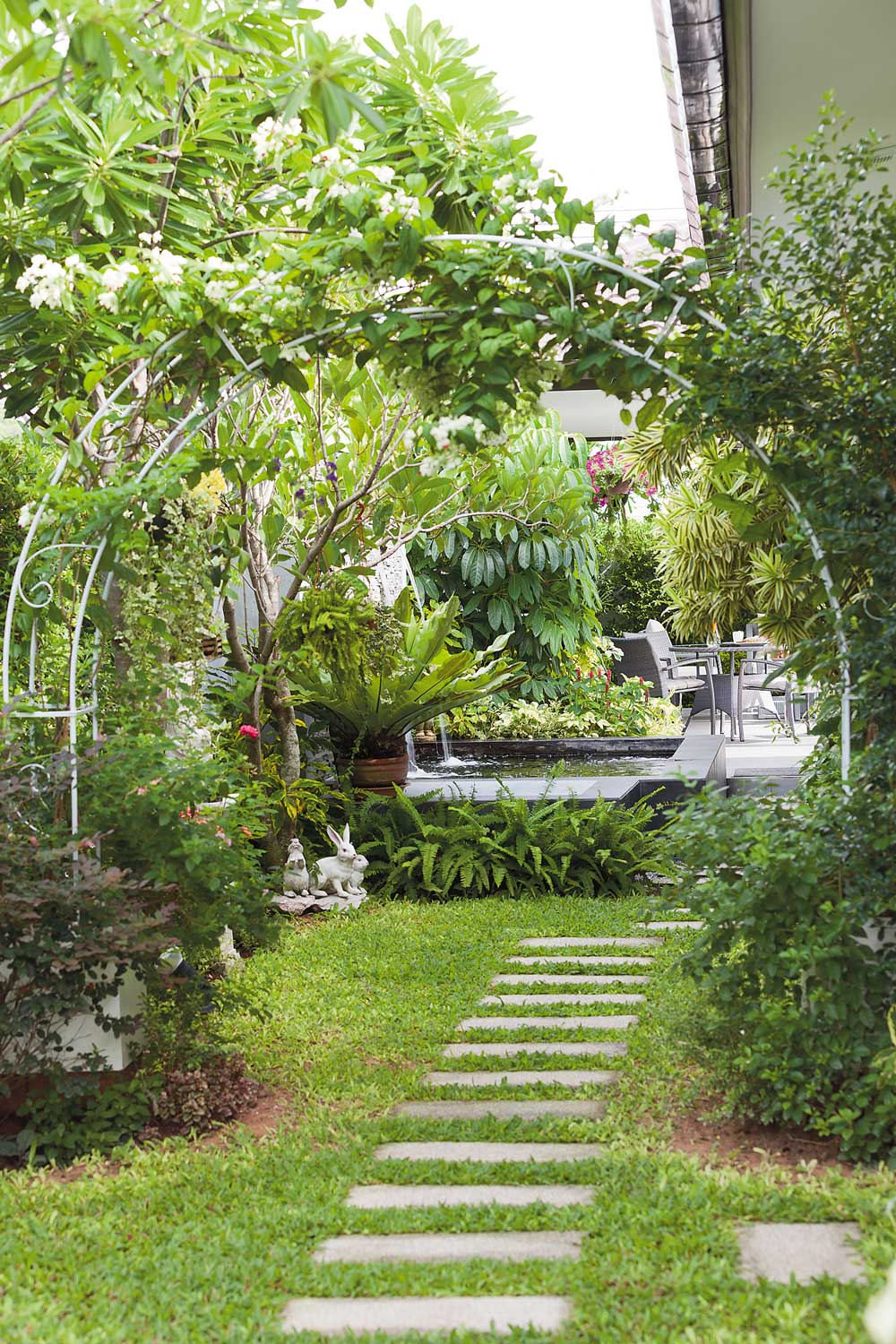 ตั้งแต่บริเวณหน้าประตูรั้วของบ้านหลังนี้ช่วยสร้างความรู้สึกสดชื่นเย็นตาให้ผู้ผ่านไปมาได้เป็นอย่างมาก ด้วยสีสันของพรรณไม้พุ่มหลากชนิด รวมทั้งไม้กระถางที่ตั้งวางเรียงรายอยู่บนกำแพง ส่วนภายในรั้วบ้านนั้นวางชุดเฟอร์นิเจอร์สไตล์อังกฤษสีขาวเด่นบนลานพื้นฮาร์ดสเคป แล้วปลูกหูกระจงด่างและจันทน์ผาเป็นหลักไม้ประธาน ประกอบกับไม้พุ่มระดับกลางจนถึงขนาดเล็ก โดยมีแผ่นทางเดินทอดยาวบนพื้นสนามหญ้าลอดผ่านซุ้มไม้เลื้อย เชื่อมต่อไปยังสวนด้านใน ซึ่งสร้างเป็นผนังน้ำตกและบ่อเลี้ยงปลาคาร์ป
