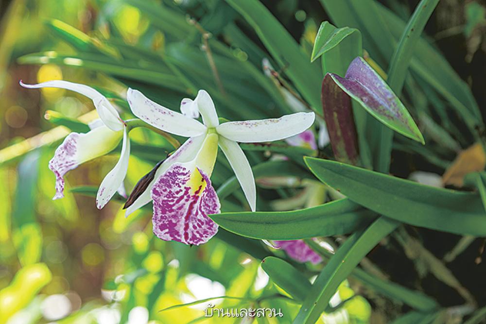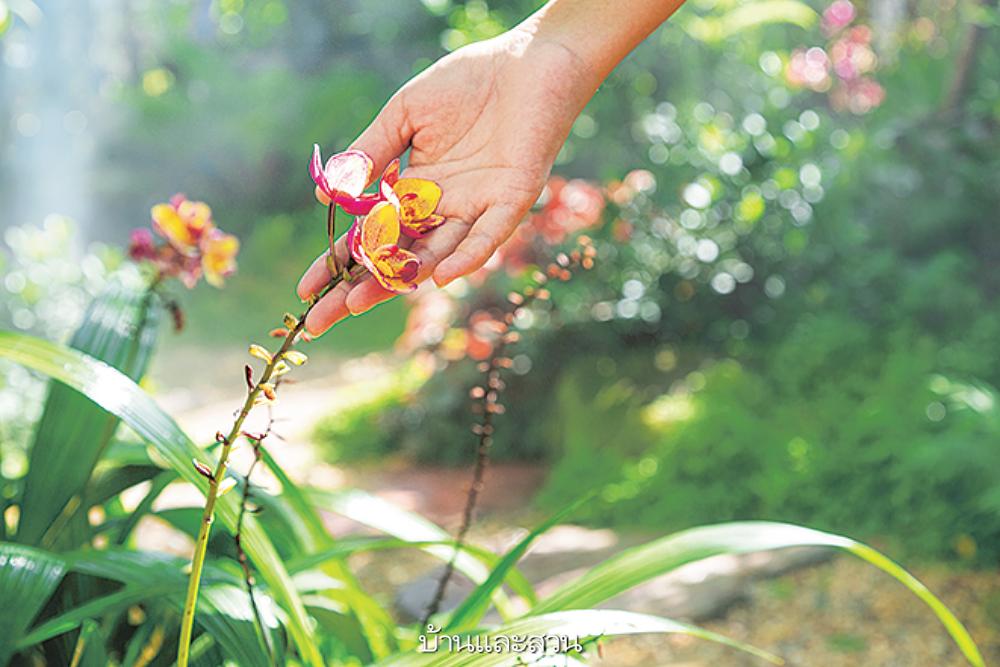 “สวนนี้ไม่มีปัญหาเรื่องดิน ปรับพื้นที่แค่นิดหน่อย ลงดินทำเนินปลูกต้นไม้ตามปกติ ในอนาคตก็อาจมีเรื่องดินทรุดบ้างแต่ไม่น่ามาก ถ้ากรวดยุบก็แค่เติมเพิ่ม ส่วนบริเวณที่ปลูกต้นไม้รากก็ช่วยพยุงดินไว้อยู่แล้ว ต้นไม้ที่นี่ไม่มีอะไรต้องดูแลเป็นพิเศษ ปล่อยโตตามธรรมชาติ เรารู้ว่าโตที่สุดแค่ไหนที่เขาจะสวย ถ้ายังไม่ได้อย่างที่ต้องการก็ปล่อยให้โตไปก่อน แต่ถ้าเลยจุดที่ต้องการก็แค่ตัดแต่งคุมไว้ สำคัญที่ตำแหน่งปลูก หันต้นถูกมุมไหม ได้มุมมองที่สวยไหม ต้นไม้ที่ใช้ก็เหมาะกับสวนแนวทรอปิคัล เพิ่มพวกกล้วยไม้ตามที่เจ้าของบ้านชอบในบางจุด ปลูกกล้วยไม้ดินแซมในกลุ่มไม้ใบบ้าง หรือนำไปเกาะตามต้นไม้ใหญ่บ้าง