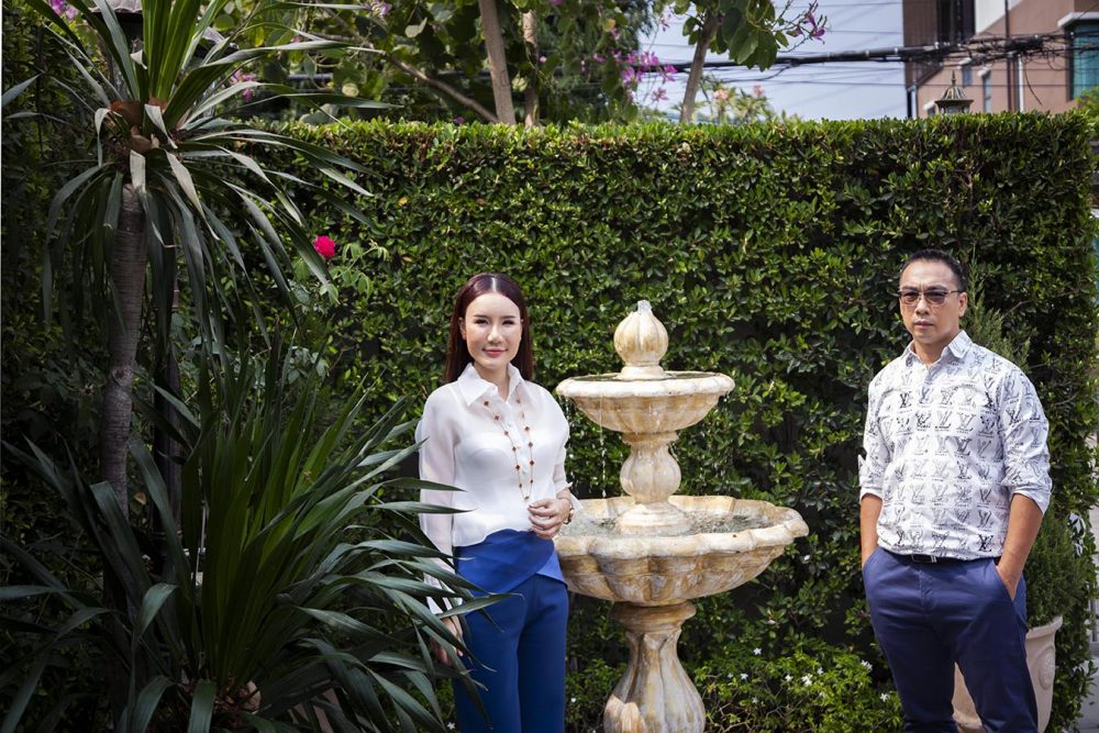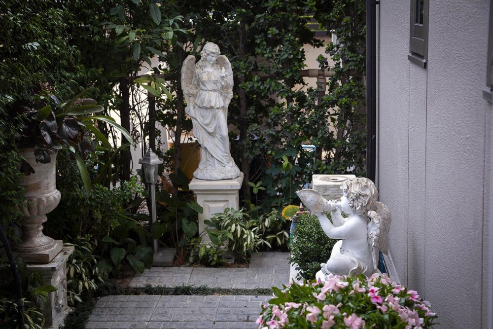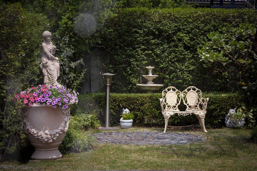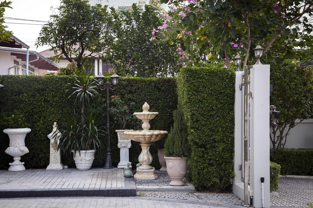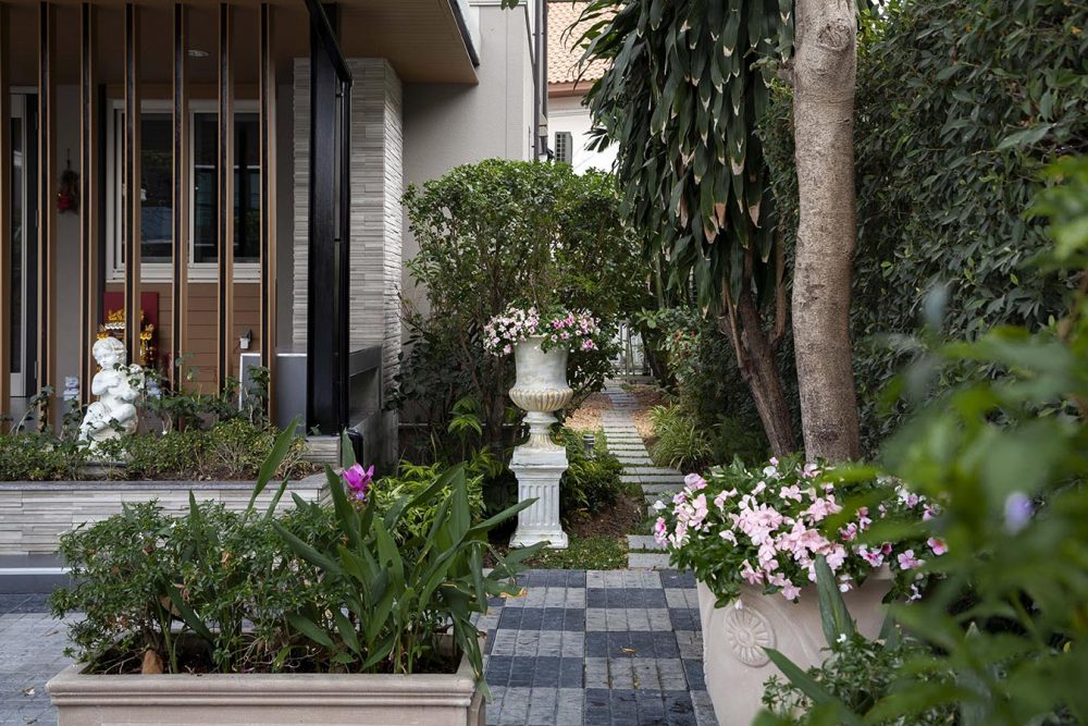เริ่มจากการร่นรั้วจากถนนหน้าบ้านกว่า 4 เมตร เนื่องจากที่ดินมีลักษณะเป็นที่ดินตอนลึก การร่นนี้จึงช่วยให้เวลาขับรถเข้าบ้าน จะมีพื้นที่ให้รถจอดเพื่อรอจังหวะรอเปิดประตู ไม่ขวางทางถนนสาธารณะ ในส่วนของงานภูมิทัศน์ได้ คุณภรณ์ทิพย์ อัคควิบูลย์ เข้ามารับหน้าที่ออกแบบและดูแล เนื่องจากชื่นชอบสวนฝรั่งเศส ทั้งยังมีพื้นฐานเรื่องการออกแบบอยู่แล้ว จึงนำไอเดียสวนฝรั่งเศสมาปรับใช้กับหลักฮวงจุ้ย โดยหากอยู่ในบ้านแล้วหันหน้าไปทางประตูรั้ว ตามหลักฮวงจุ้ยฝั่งซ้ายหมายถึงผู้ชาย ฝั่งขวาหมายถึงผู้หญิง จึงสร้างความสมดุลด้วยการเพิ่มไม้ยืนต้นในฝั่งซ้ายเพื่อความมีตัวตนของผู้อยู่อาศัยชาย และให้ความรู้สึกมั่นคง ส่วนด้านขวาทำการเพิ่มไม้พุ่มให้ความรู้สึกอ่อนโยน ที่สำคัญในบ้านไม่ควรมีต้นไม้หรือตอไม้ตายซาก