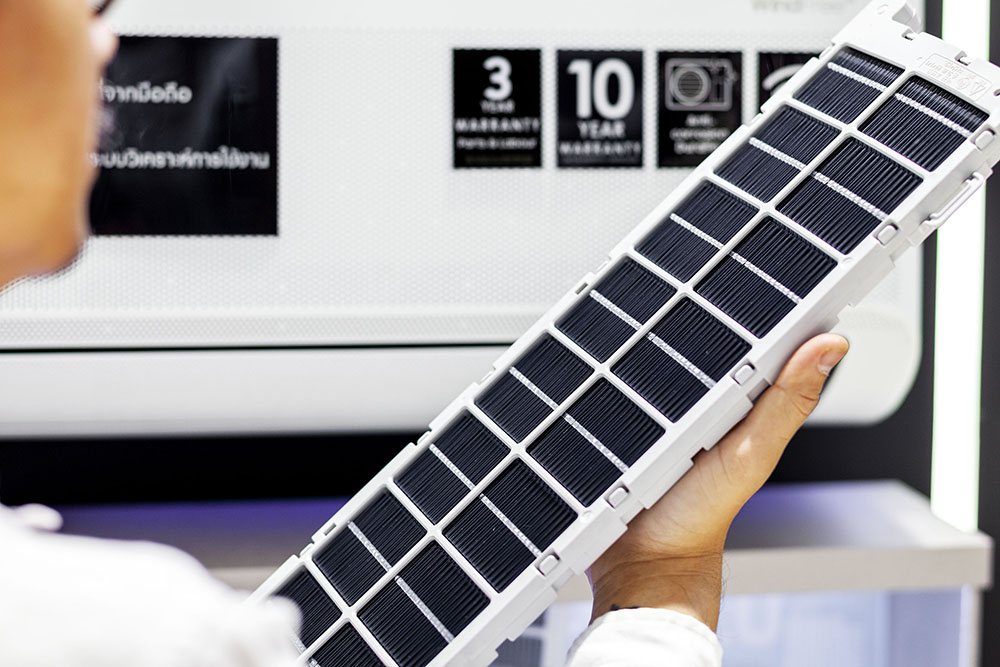 ยิ่งในวันที่PM 2.5 และโรคร้ายกระจายตัวอยู่ทั่วไป เครื่องปรับอากาศที่กรองสิ่งไม่พึงประสงค์ได้อย่างหมดจด ช่วยสร้างบรรายากาศในบ้านให้น่าอยู่และอุ่นใจมากขึ้นเครื่องปรับอากาศ Samsung WindFree™กรองอากาศให้บริสุทธิ์ด้วยแผ่นกรองTri-care Filter ถึง 3 ชั้น จาก Pre Filter ที่จะกรองอนุภาค PM 10 และ PM 2.5 ก่อนจะผ่านกรองชั้นละเอียดที่ PM 1.0 ฝุ่นอนุภาคขนาดจิ๋วจึงไม่สามารถเล็ดลอดเข้าสู่ระบบทำความเย็นได้ นอกจากนี้ด้วยแผ่นกรองที่เคลือบสาร Zeolite และ AG+ จึงทำให้สามารถดักจับและกำจัดเชื้อโรค แบคทีเรีย ไวรัส และสารก่อภูมิแพ้ ได้อย่างมีประสิทธิภาพ