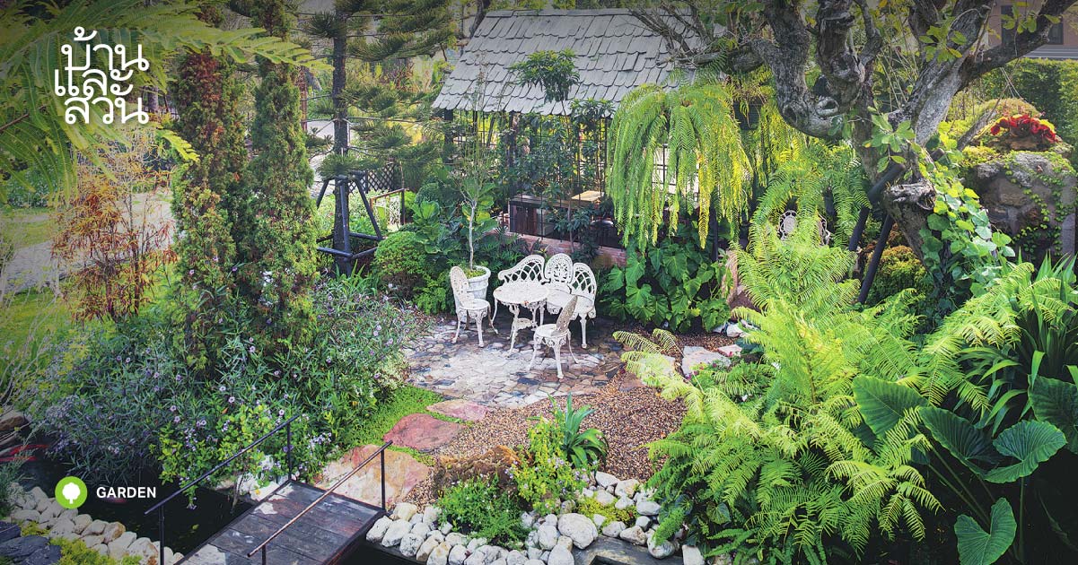 “จุ๋มอยากได้สวนป่าที่ร่มรื่นแต่ไม่รกและอยากได้สวนครัวด้วยค่ะ แต่คุณศักดิ์แนะนำว่าสวนครัวต้องดูแลค่อนข้างมาก และถ้าตัดผักไปแปลงปลูกก็จะโล่งๆ ถ่ายรูปไม่สวย เพราะเราตั้งใจอยากให้มีมุมถ่ายรูปหลายๆ มุมค่ะ ก็เลยเปลี่ยนเป็นสวนสมุนไพรแทน และทำบ้านหลังคาต้นไม้ซึ่งคุณศักดิ์ไม่เคยทำให้ที่ไหน รอบๆ ก็เป็นสวนอังกฤษ นำพวกหินและไม้เก่าที่จุ๋มเก็บไว้มาใช้ ที่นี่เลยมีสวนสองแบบ ด้านหนึ่งเป็นสวนป่าน้ำตก อีกด้านเป็นสวนอังกฤษ ตอนนั้นจุ๋มก็ไม่รู้หรอกนะค่ะว่าคุณศักดิ์จะทำอะไรบ้าง เพราะไม่มีแบบมาให้เห็น แค่บอกคร่าวๆ ว่าจะทำอะไรตรงไหน ไม่ได้ลงรายละเอียดมานัก แต่ก็เชื่อใจและเชื่อฝีมือค่ะว่าต้องออกมาสวยแน่ๆ พอสวนเสร็จและสวยขนาดนี้ เลยต้องรื้อเพิงเดิมแล้วสร้างอาคารหลังใหม่ เปิดเป็นคาเฟ่ที่ขายทั้งอาหารและเครื่องดื่มแทนก๋วยเตี๋ยวค่ะ”
