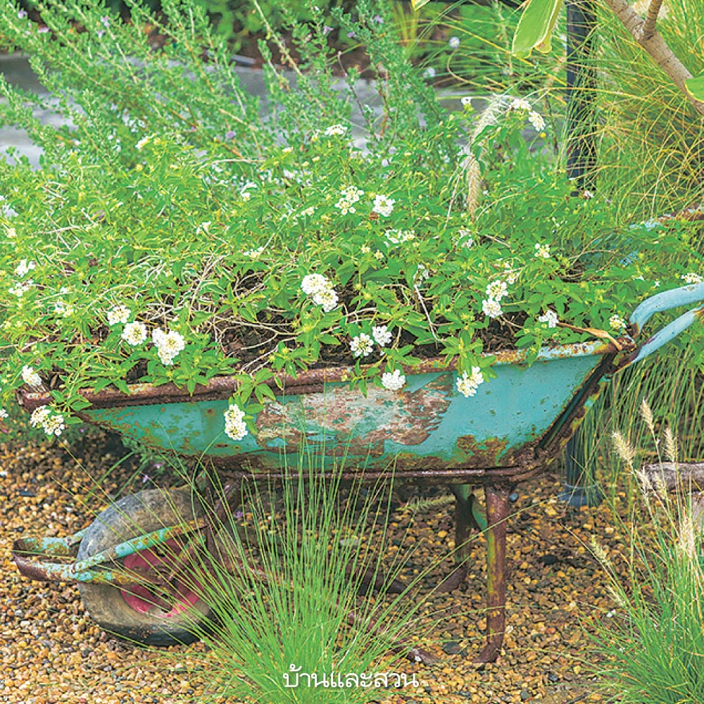 “เอกลักษณ์ของสวนคอตเทจคือจะใช้ไม้ดอกค่อนข้างมาก ผมตั้งใจใช้ไม้ดอกที่หาได้ทั่วไปและเติบโตได้ดีในบ้านเรา ไม่ต้องดูแลมาก เลือกไม้ดอกล้มลุกอายุหลายปีมาใช้ เช่น ผกากรอง แพงพวย ต้อยติ่ง ยี่โถ ซึ่งออกดอกได้เรื่อยๆ แค่ต้องตัดแต่งบ้าง เลือกใช้ไม้ใหญ่ที่มีฟอร์มต้นสวยๆ เช่น น้ำเต้าต้น ทองกวาว รวมไปถึงมะพร้าว กล้วยน้ำว้า ส้มโอ ปลูกมะนาวแทนเลมอน มีมะกรูด ตะไคร้ เตยหอม มินต์เป็นพืชสมุนไพรปลูกแซมบางส่วน ปนไปกับต้นไม้ที่นิยมใช้ในสวนอังกฤษ เช่น สนสามใบ โรสแมรี่ หญ้าน้ำพุ มากาเร็ต เรานำสไตล์สวนมาใช้แต่ปรับเปลี่ยนต้นไม้ที่ เพื่อให้ยังคงกลิ่นอายของสวนอังกฤษไว้ครับ”