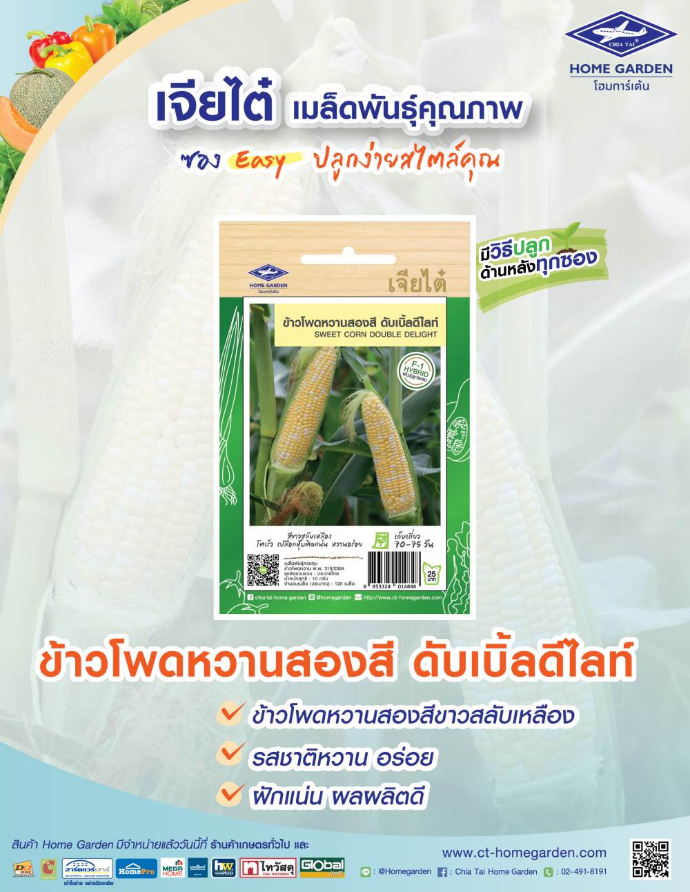 ข้าวโพดหวานสองสี ดับเบิ้ลดีไลท์ ข้าวโพดหวานสองสี ขาวสลับเหลือง หวาน เนื้อแน่นทุกเมล็ด ฝักแน่น ผลผลิตดี ปลูกง่าย รายได้งาม