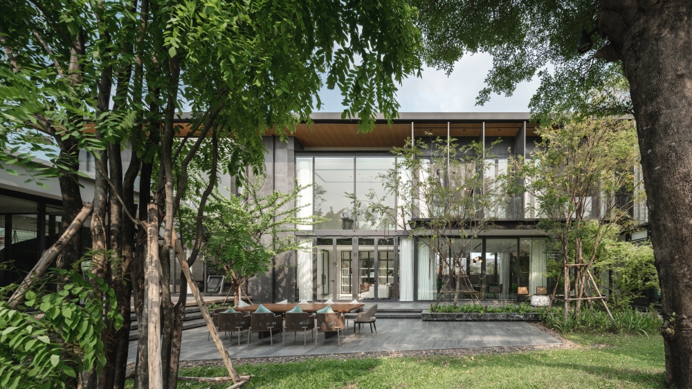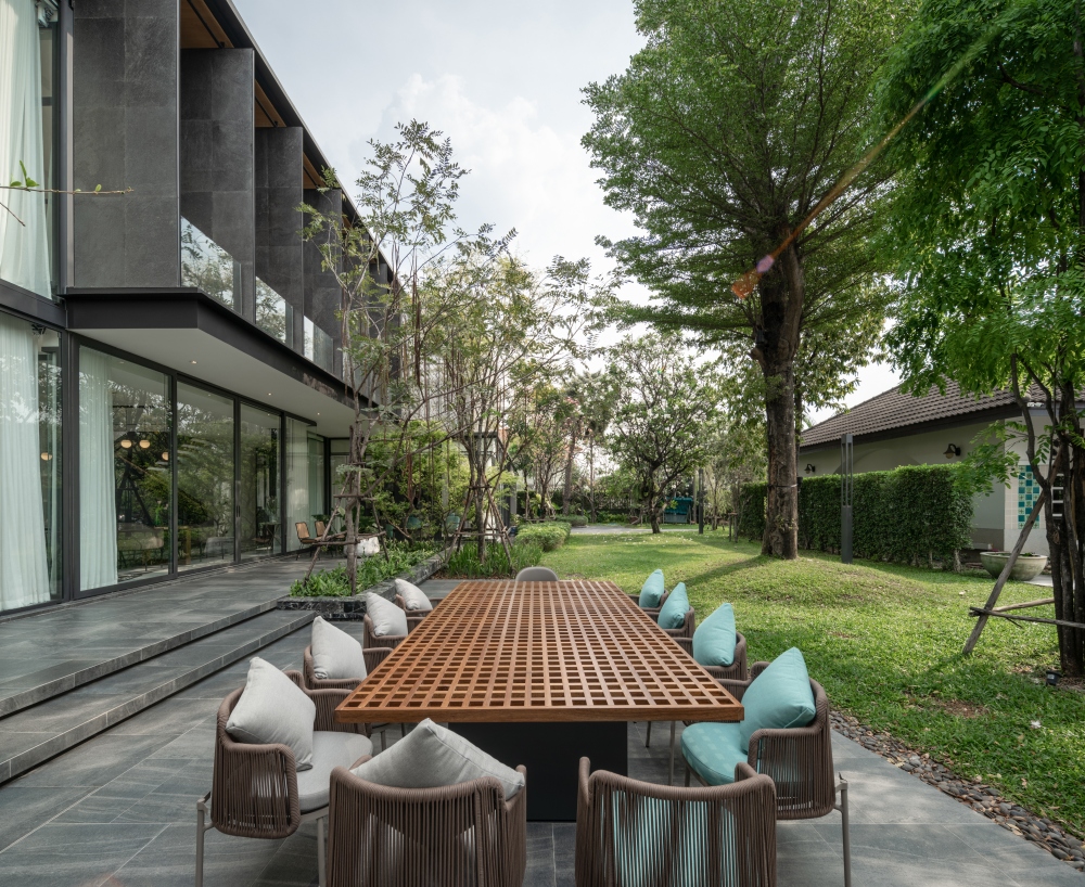 เพราะหัวใจหลักของบ้านคือสวนคอร์ตที่เชื่อมต่อระหว่างบ้านของคุณพ่อคุณแม่กับบ้านของคุณพลุและคุณนิกกี้ ซึ่งเดิมปลูกต้นไม้ใหญ่แบบเรียงเป็นแถวและมีลานจัดงานเลี้ยงค่อนข้างใหญ่ แต่เมื่อฟังก์ชันการจัดเลี้ยงเริ่มมีน้อยลง ทาง URBANIS Landscape Architecture & Master Planningผู้ออกแบบแลนด์สเคปจึงลดพื้นที่ส่วนนี้ให้เล็กลงและจัดระเบียบต้นไม้เดิมใหม่เพื่อให้สวนคอร์ตนี้สามารถแบ่งแยกพื้นที่บ้านทั้งสองหลังได้แต่ต้องไม่ตัดขาดออกจากกัน