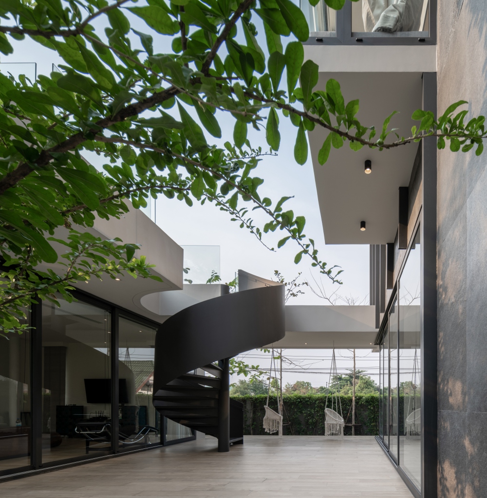 ต้นไม้ใหญ่หลายต้นเป็นต้นเดิมจากบ้านคุณพ่อคุณแม่ที่ย้ายมาจัดวางใหม่ให้มีมิติมากขึ้น เช่น หูกระจง และลั่นทม แล้วเปลี่ยนต้นที่มีทรงพุ่มไม่สวยออกไป เติมต้นน้ำเต้าและกระพี้จั่นที่มีใบละเอียดเพื่อทำให้เกิดความคอนทราสต์กับตัวสถาปัตยกรรมที่เรียบเท่ได้อย่างน่ามอง รวมถึงเน้นต้นที่มีลำสูงเพื่อเปิดมุมมองของชั้นล่างแล้วไปแตกพุ่มเพื่อโชว์ลีลาของกิ่งก้านและแผ่กลุ่มใบเขียวพอดีกับชั้น 2 จึงช่วยกรองแสงและพรางสายตาได้ดี