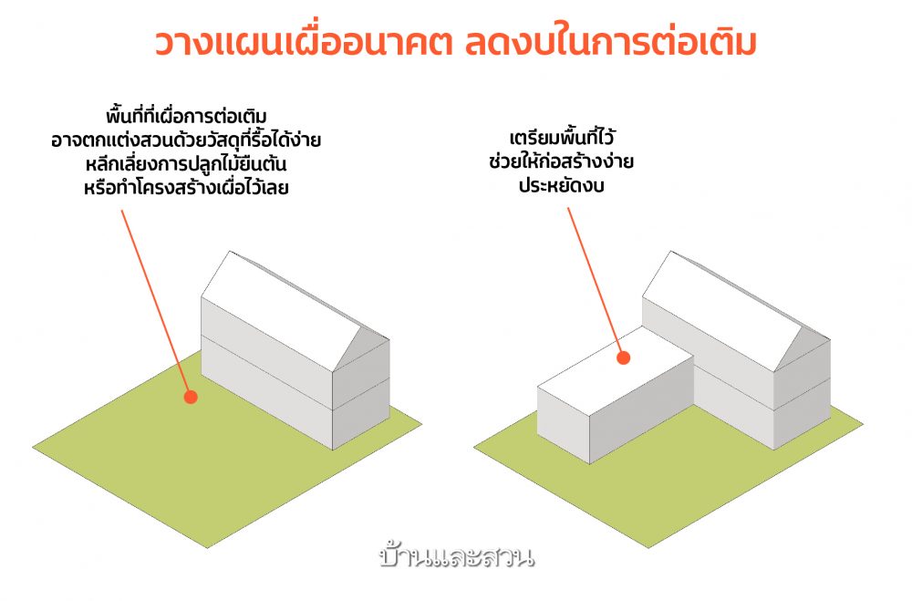 ลองวางแผนการใช้พื้นที่บ้านและที่ดินใน 5 – 10 ปี ต่อไป เช่น การปรับเปลี่ยนฟังก์ชันของห้อง การจะมีสมาชิกเพิ่ม หรือการต่อเติมบ้าน เพื่อออกแบบบ้านและเตรียมโครงสร้างเผื่อไว้รองรับการปรับเปลี่ยน หรือใช้วัสดุที่รื้อได้ง่าย อาจวางแผนการก่อสร้างและใช้พื้นที่แบ่งเป็น 2-3 เฟส จะทำให้การออกแบบภาพรวมของบ้านอยู่ในทิศทางเดียวกัน และสามารถบริหารงบประมาณได้