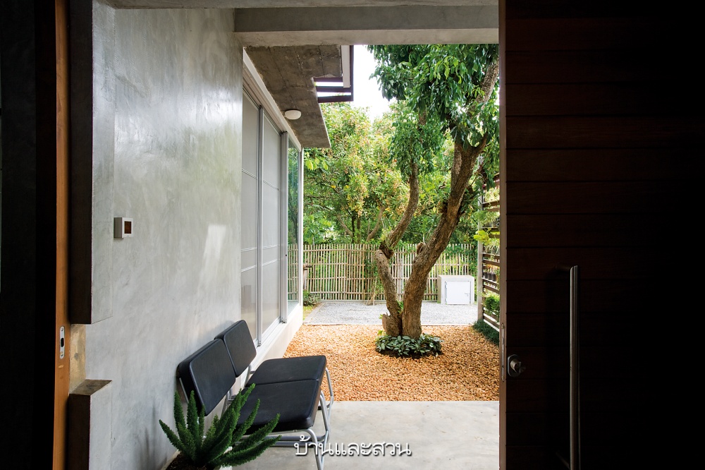 “ส่วนสวนก็เน้นที่ดูแลรักษาง่าย จุดเด่นอยู่ที่ต้นลำไยซึ่งอยู่กลางที่ดินมาก่อนที่เราจะสร้างบ้าน เราสองคนไม่อยากตัดทิ้งจึงออกแบบให้สร้างบ้านล้อมลำไยต้นนี้ไปเลย”