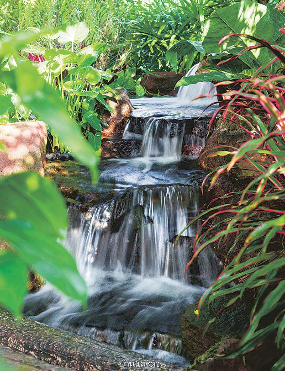 การมีบ้านสักหลังพร้อมสวนสวยๆ รอบบ้านคืออีกหนึ่งความฝันที่หลายคนปรารถนา ระหว่างที่ตั้งใจทำฝันให้เป็นจริง ก็หาข้อมูลดูแบบบ้านที่ใช่ ดูแบบสวนที่ชอบไปพรางๆ เพื่อสักวันที่พร้อมและมีโอกาสจะได้สานฝันนั้นให้กลายเป็นความจริงเหมือนเจ้าของบ้านหลังนี้ ที่มีสวนป่าขนาดเล็กที่มีทั้งน้ำตกและบ่อปลาขนาดย่อม มีก้อนหินทรายสีแดงวางเรียงอยู่ริมขอบบ่อให้เดินลัดเลาะไปได้รอบๆ รายล้อมไปด้วยต้นไม้ใหญ่น้อยหลากหลายชนิด