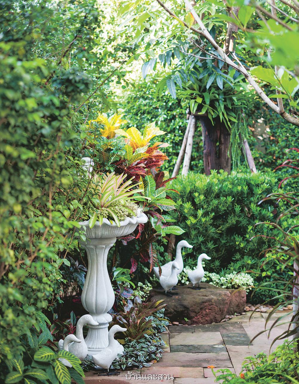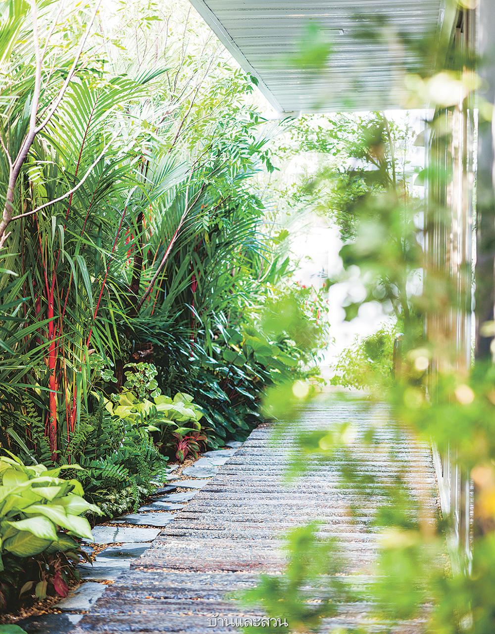 “ในส่วนของต้นไม้ก็มีการย้ายตำแหน่งต้นไม้เดิมบ้างเพื่อให้อยู่ถูกที่ถูกทาง ไม้ใหญ่ที่ลงเพิ่มคือไม้ผลที่เจ้าของบ้านอยากได้ เช่น มะม่วงน้ำดอกไม้ มะม่วงบางขุนศรี มะนาว และทำแปลงปลูกผักสวนครัวเพิ่มให้ที่หลังบ้าน อีกส่วนคือไม้ดอกหอม มีทั้งแก้วมุกดา แก้วหิมาลัย พุดกุหลาบ พุดกังหัน พุดน้ำบุษย์ ประยงค์ ลำดวน บุหงาส่าหรี่ โมกพวง แก้วเจ้าจอม ผมจะเลือกชนิดของต้นไม้ที่ใช้ไว้ค่อนข้างละเอียดตั้งแต่ออกแบบ อาจมีปรับเปลี่ยนบ้างเพื่อให้เหมาะสมกับพื้นที่และสภาพแสง หรือในกรณีที่หาต้นที่ต้องการไม่ได้ ที่นี่ส่วนใหญ่ผมจะเลือกใช้ต้นไม้ที่เหมาะกับสวนป่าเป็นหลัก และเป็นต้นไม้ที่ใช้เป็นประจำ ซึ่งเรามั่นใจว่าต้นไม้พวกนี้โตได้ดี ดูแลง่าย ไม่ค่อยมีปัญหา และลงไม้ใบช่วยเพิ่มสีสันแทนไม้ดอก เช่น หมากผู้หมากเมีย โกสน ฤๅษีผสม บีโกเนีย ที่เพิ่มขึ้นมาคือกล้วยไม้ เฟินสไบนางเกาะตามต้นไม้ใหญ่ช่วยเติมบรรยากาศของสวนป่าที่ดูสมบูรณ์ยิ่งขึ้นครับ”