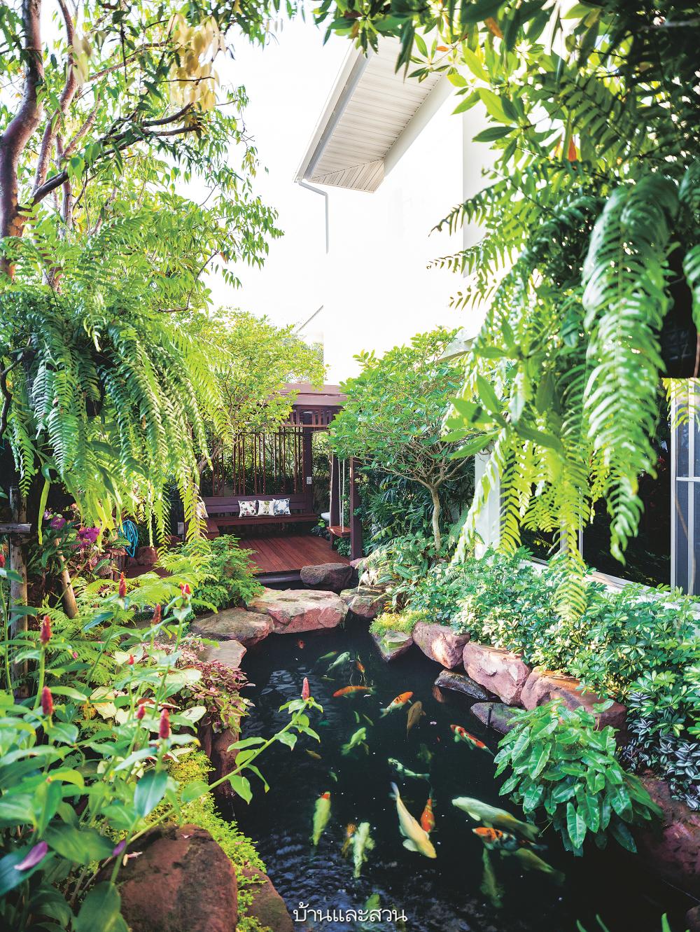 บนพื้นที่กว่า 150 ตารางวาได้จัดสรรให้เป็นพื้นที่สวนไปกว่าครึ่ง ตัวบ้านอยู่ค่อนไปทางด้านหลัง ด้านหน้ามุมหนึ่งเป็นสวนป่าขนาดย่อมที่มีทั้งน้ำตกและบ่อปลาขนาดใหญ่ มีก้อนหินทรายสีแดงวางเรียงอยู่ริมขอบบ่อให้เดินลัดเลาะไปได้รอบๆ รายล้อมไปด้วยต้นไม้ใหญ่น้อยหลากหลายชนิด และมีศาลาไม้หลังใหญ่ทางด้านใน ส่วนด้านหน้าอีกมุมเป็นลานหินทรายโล่งกว้าง วางชิงช้าไว้ให้นั่งชมวิว มีอ่างน้ำนกและน้ำพุเล็กๆ น่ารักๆ ตั้งอยู่ตรงประตูทางเข้าบ้าน มองผ่านโรงจอดรถเห็นสวนอีกมุมอยู่ไกลๆ ตั้งชุดเก้าอี้นั่งเล่นสีขาวสะดุดตาท่ามกลางไม้ใบสีสันสดใส และดูเหมือนจะเป็นสวนอีกสไตล์ที่ต่างออกไป