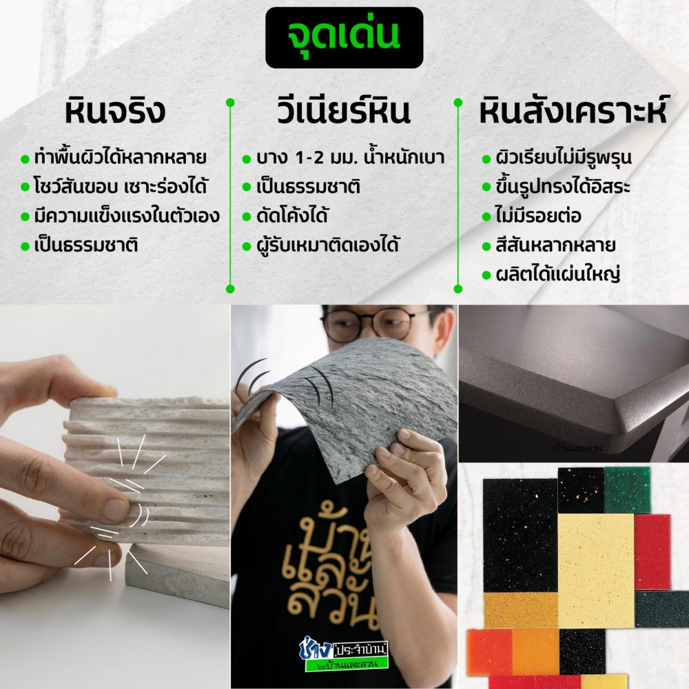 เปรียบเทียบวัสดุหิน ทั้งหินจริง วีเนียร์หิน หินสังเคราะห์ อะไรดีกว่ากัน? อะไรถูก อะไรแพง? รวมถึงวิธีเลือกใช้ ทั้งกรุผนัง ปูพื้น ทำเคาน์เตอร์ มารู้จักวัสดุทั้ง 3 ประเภทนี้กัน