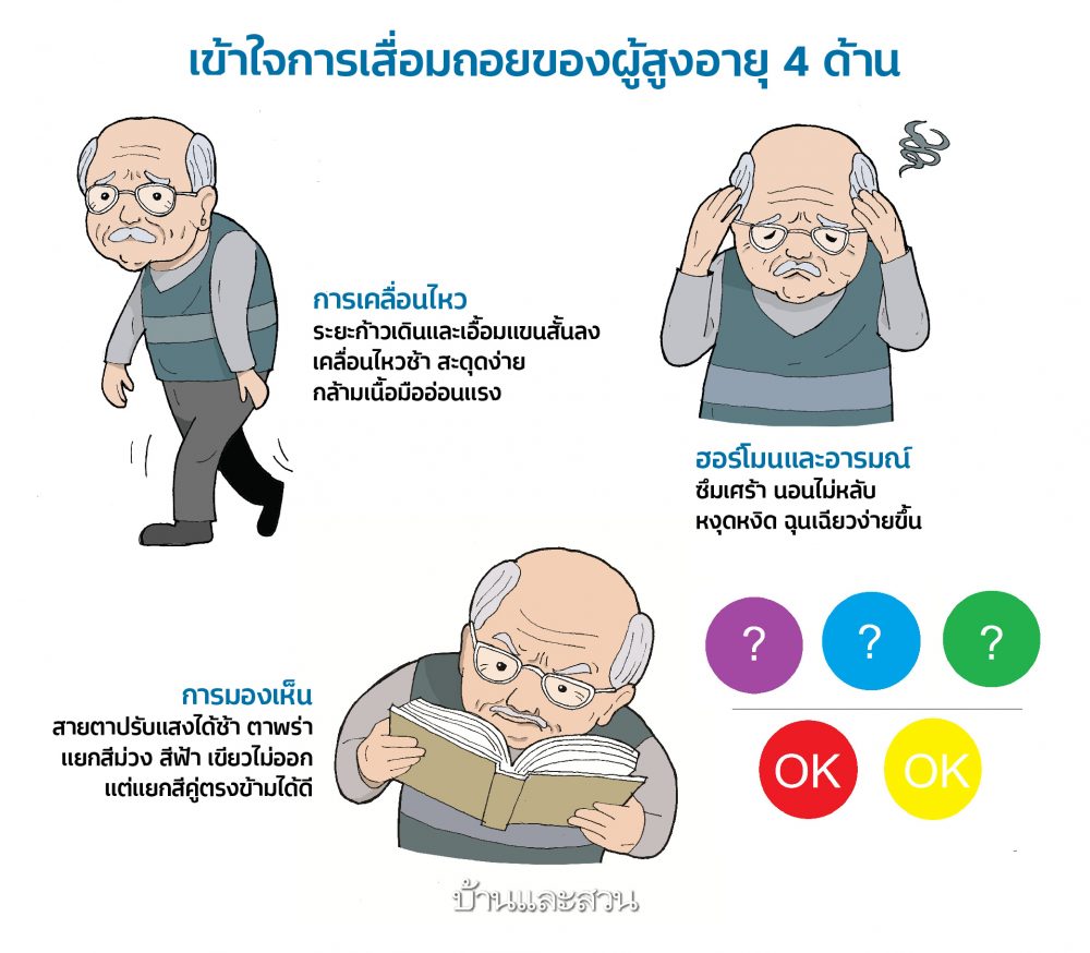 หากสังเกตว่าคุณปู่คุณย่าทำกิจวัตรประจำวันลำบากขึ้น จนบางท่านเกิดอาการท้อแท้ หดหู่ เพราะต้องพึ่งพาลูกหลานมากขึ้นทุกวัน ลูกหลานอย่าเพิ่งรำคาญ เพราะทั้งหมดนี้เกิดจากการเสื่อมถอยของร่างกาย 4 ด้านหลักๆ คือ การมองเห็น การได้ยิน ฮอร์โมนและอารมณ์ และการเคลื่อนไหว ซึ่งถ้าเข้าใจสิ่งเหล่านี้แล้ว ก็จะปรับ บ้านผู้สูงอายุ ให้ท่านใช้ชีวิตได้สะดวกและมีความสุขได้