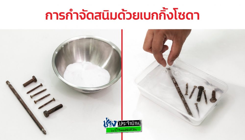 เบกกิ้งโซดาหรือผงมหัศจรรย์ที่ใช้งานได้ครอบจักรวาลนั้น เป็นอีกหนึ่งตัวช่วยในการ กำจัดสนิม ได้ เหมาะกับวัสดุหรืออุปกรณ์ที่โดนสนิมเล่นงานไม่มากนัก โดยก่อนจะโรยเบกกิ้งโซดานั้น ให้ล้างอุปกรณ์ที่ต้องการ กำจัดสนิม ด้วยน้ำเปล่า พร้อมกับเช็ดให้แห้งหมาดๆ เพื่อให้ความชื้นเป็นตัวช่วยดูดจับเบกกิ้งโซดา จากนั้นทิ้งไว้อย่างน้อย 1 ชั่วโมง แล้วค่อยๆใช้แปรงขัดสนิมให้หลุดออกไป หรือเลือกใช้วิธีผสมน้ำตามอัตราส่วน แล้วนำอุปกรณ์ที่โดนสนิมเล่นงานไปแช่ทิ้งไว้เลยก็ได้