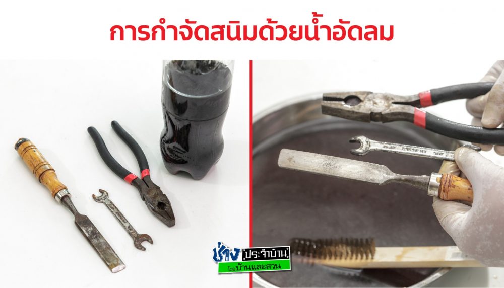 น้ำอัดลมสารพัดยี่ห้อก็เป็นสิ่งอีกหนึ่งที่ช่วยขจัดสนิมได้เหมือนกัน สามารถใช้ได้ตั้งแต่การนำของชิ้นเล็กอย่างเครื่องมือช่างมาแช่ทิ้งไว้อย่างน้อย 1/2 ชั่วโมง แล้วค่อยๆ ใช้แปรงขัดสนิมให้หลุดออกไป หรือเทราดบนพื้นที่ที่มีคราบสนิมกระจายอยู่ทั่วไปได้เลย