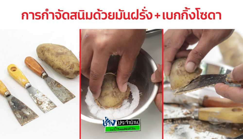เพียงนำมันฝรั่งมาหั่นครึ่ง แล้วนำไปถูคราบสนิมให้ทั่วพื้นผิว และถ้าใครอยากเพิ่มพลังในการขัด สามารถนำไปชุบกับเบกกิ้งโซดาก็ได้ ทั้งนี้มันฝรั่งสามารถช่วยกำจัดคราบสนิมได้ ก็เพราะมีกรดออกซาลิก (Oxalic acid) ช่วยไปทำปฏิกิริยากับสนิม ทำให้สนิมอ่อนตัวลงและหลุดลอกง่ายขึ้นนั่นเอง