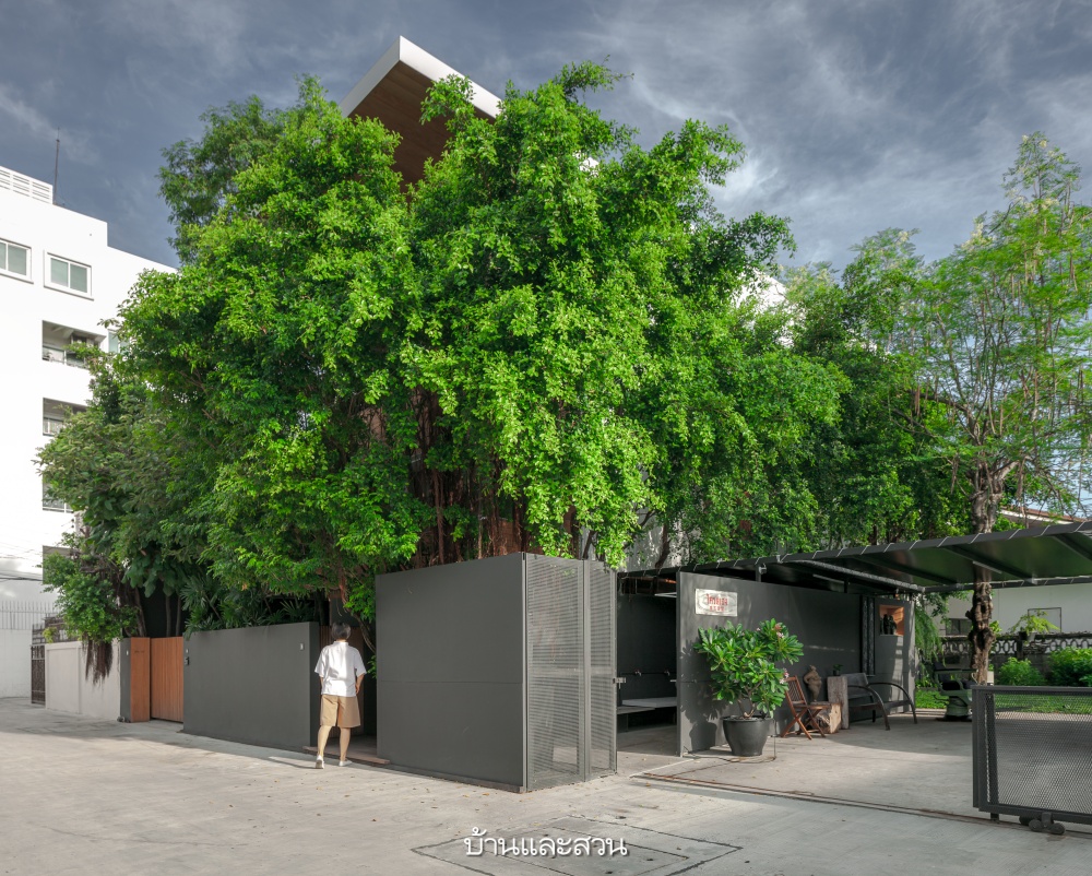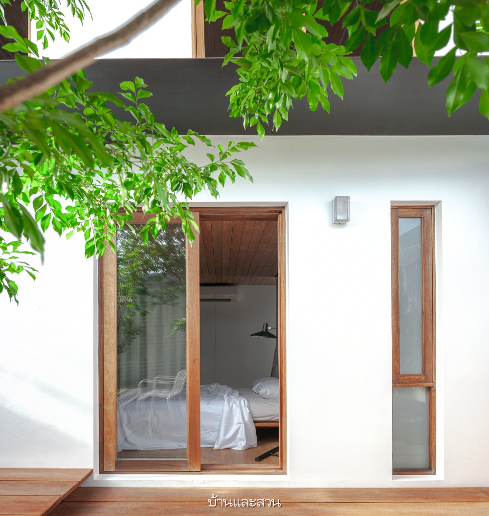 แนวทางการออกแบบตัวบ้านหลักๆ เน้นให้สอดคล้องกับบริบทของธรรมชาติที่มีอยู่เดิม เพราะคุณขจีต้องการเก็บร่มเงาและความสดชื่นทุกอย่างไว้ ระยะต่างๆ ของบ้านจึงกำหนดขึ้นมาจากการหลบเลี่ยงต้นไม้ทุกต้นที่มีอยู่ ไม่ว่าจะด้วยการเจาะช่อง ร่นระยะผนัง และเปิดคอร์ตให้ต้นไม้เหล่านี้ยังชูกิ่งก้านใบได้สวยงามเหมือนเดิม แถมยังใช้เป็นช่องแสงธรรมชาติเพื่อเอื้อต่อการเจริญเติบโตของต้นไม้เอง อีกทั้งเพิ่มความปลอดโปร่งให้ผู้อาศัยภายในบ้านไปในตัว