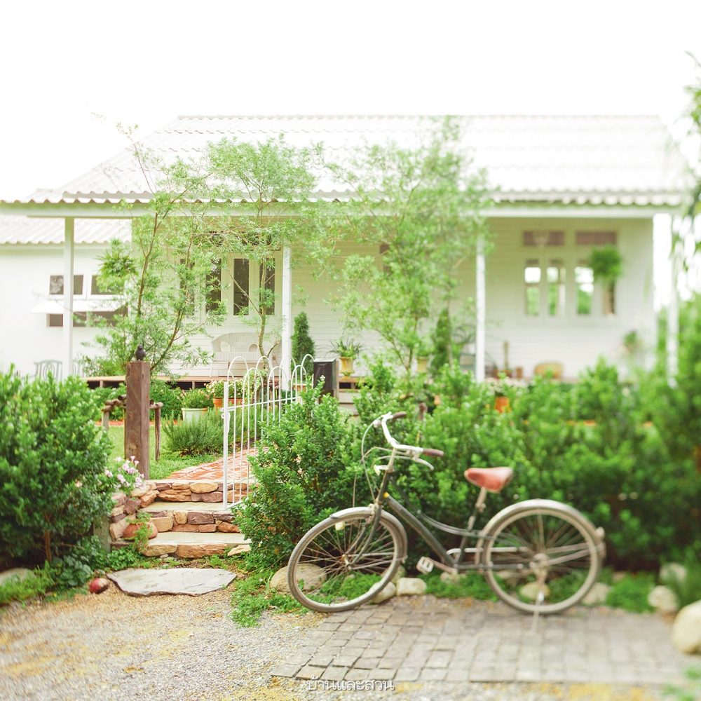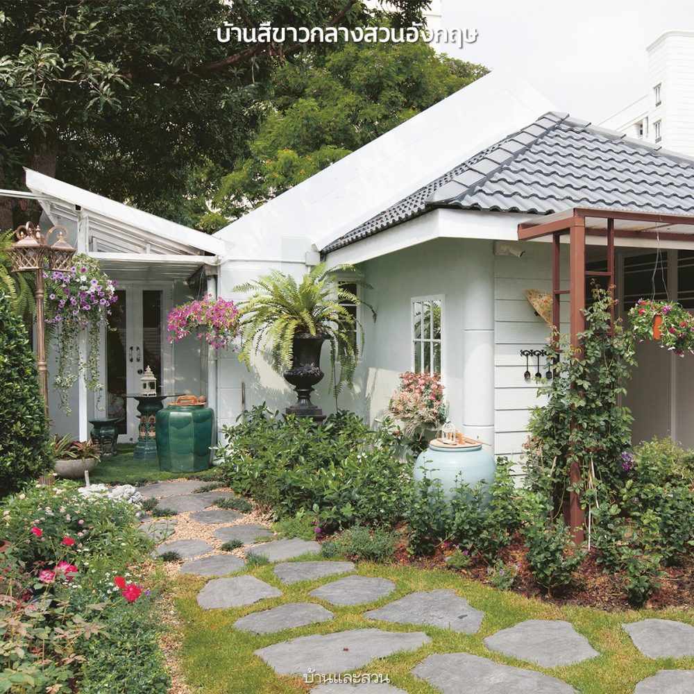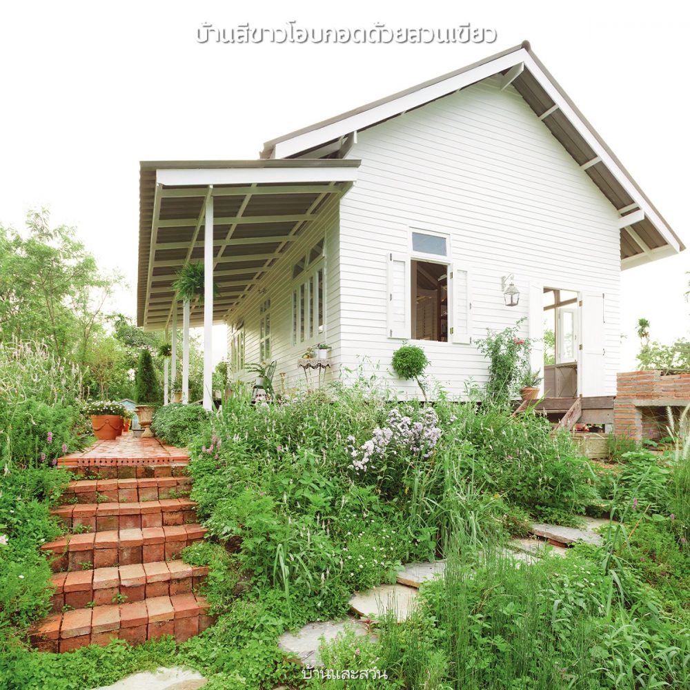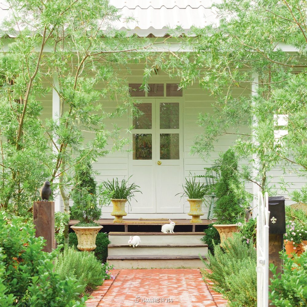 บ้านสีขาวโอบกอดด้วยสวนเขียว