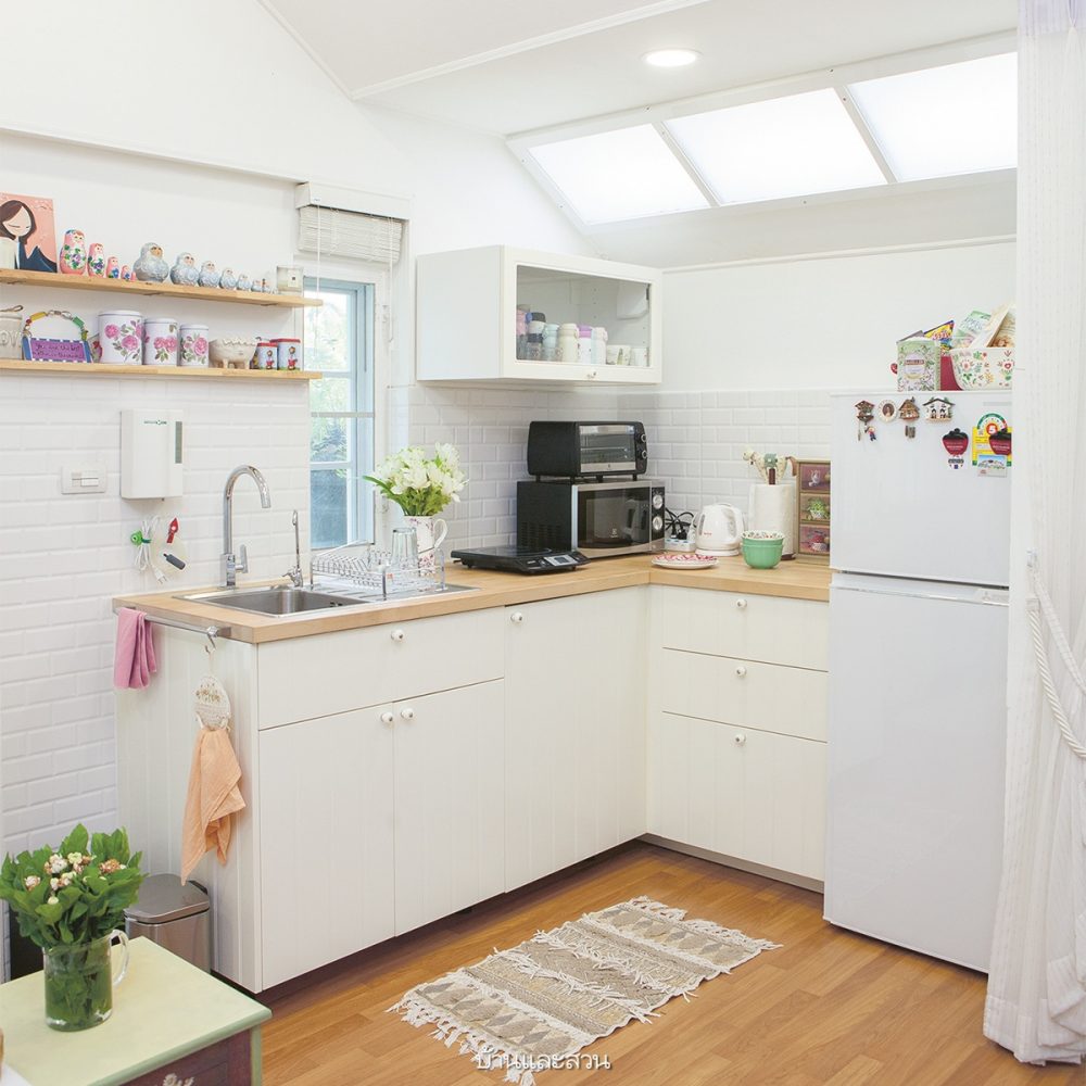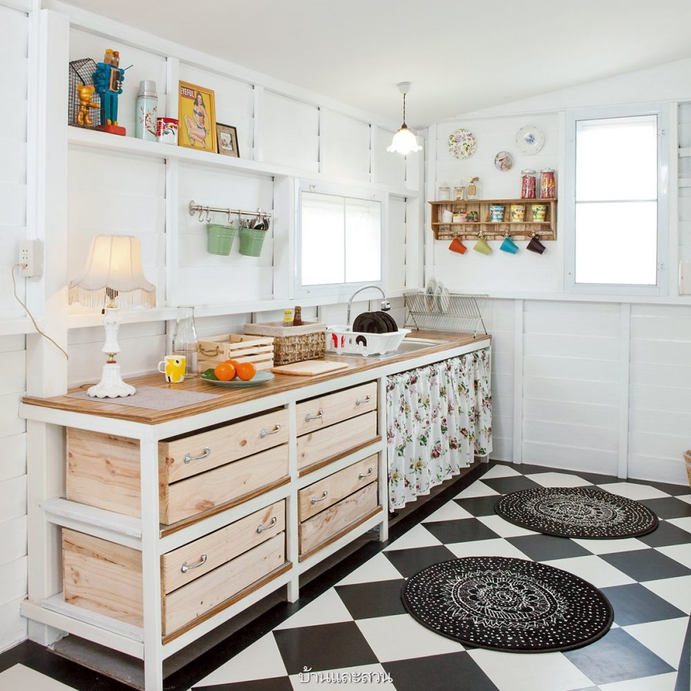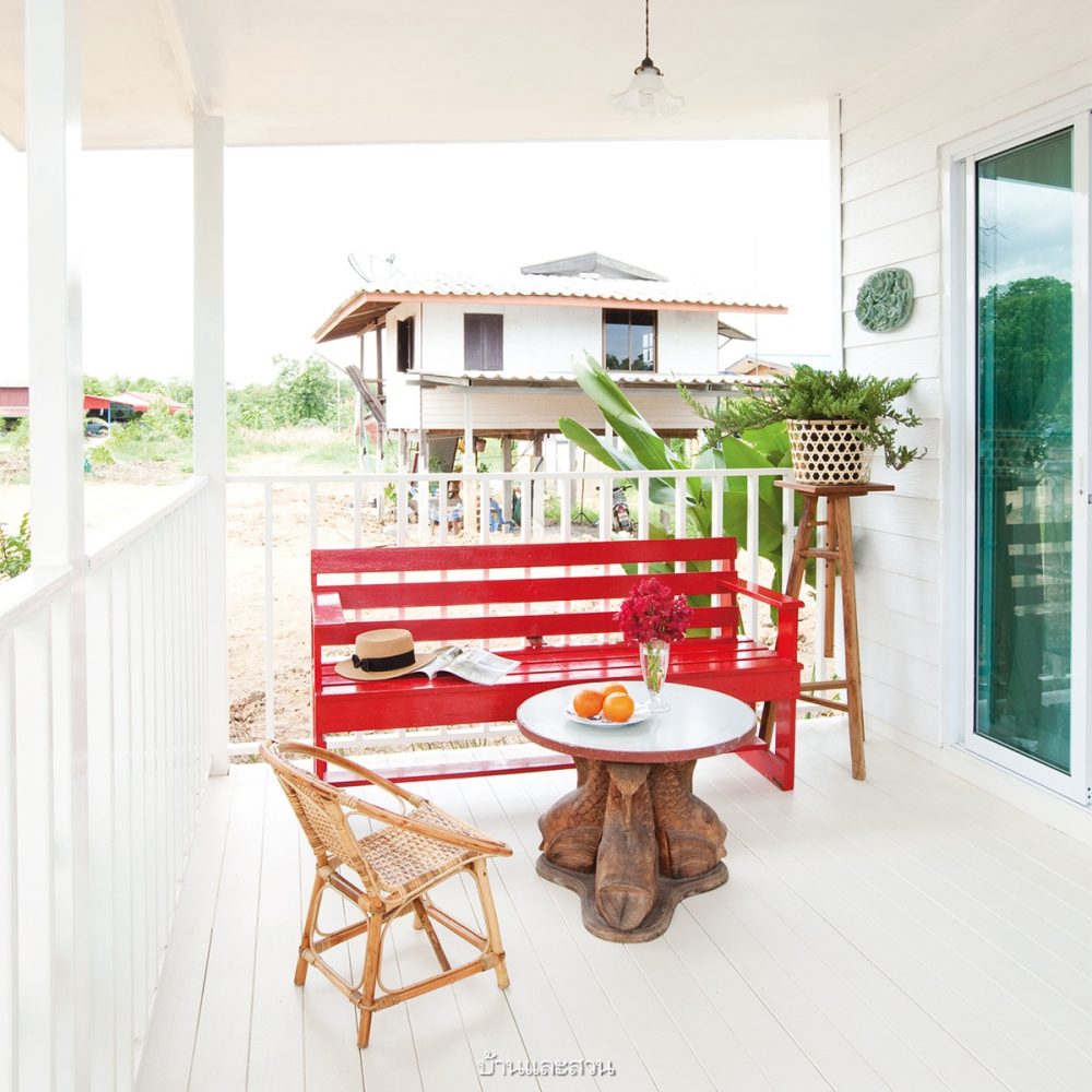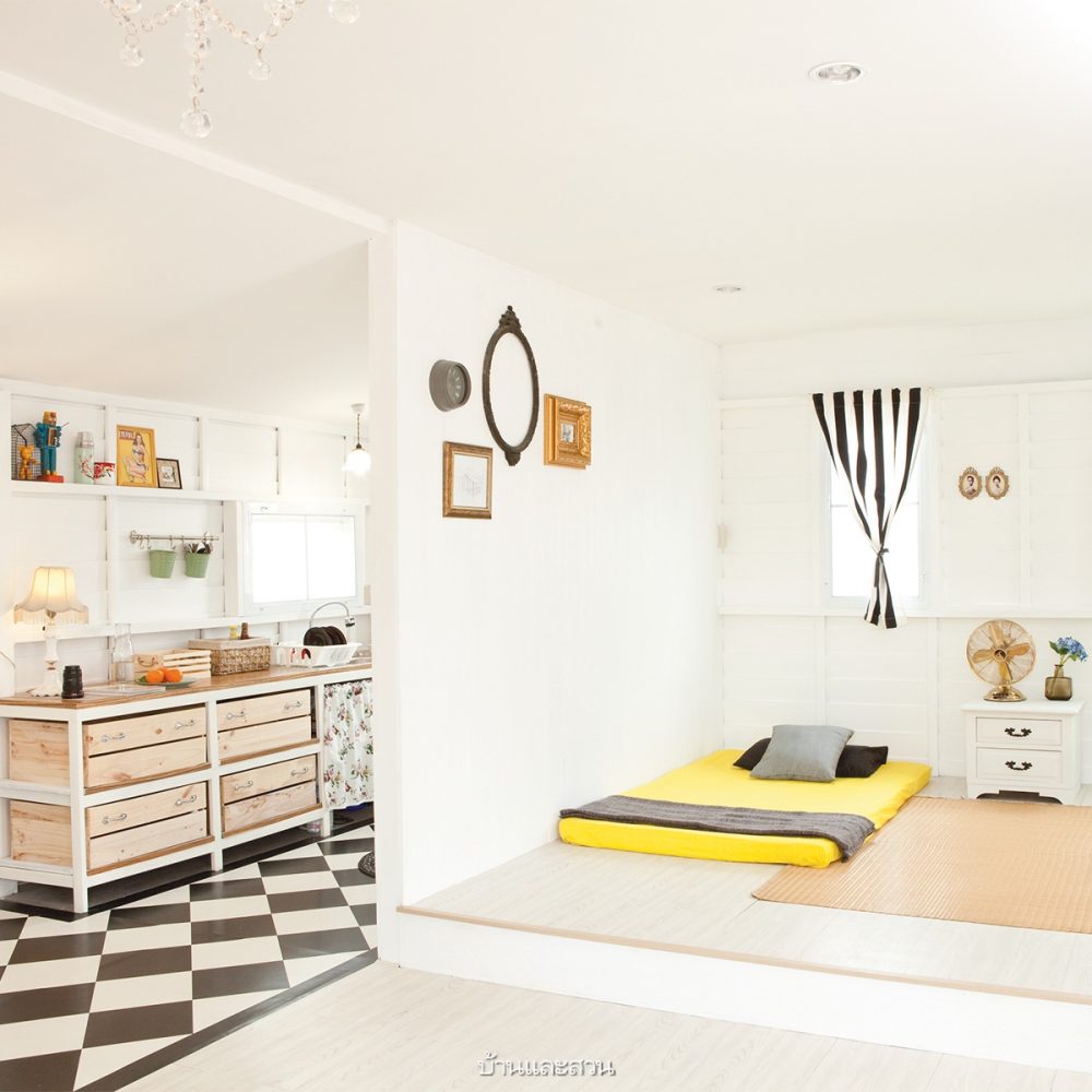 บ้านสีขาวหลังเล็ก ที่ตกแต่งในสไตล์วินเทจตามความชอบของเจ้าของบ้าน โครงสร้างของตัวบ้านใช้โครงเหล็ก กรุผนังด้วยไม้ฝาเฌอร่าสีขาว ปูพื้นภายนอกด้วยวีว่าบอร์ด ภายในห้องครัวปูพื้นด้วยกระเบื้องยางซึ่งติดตั้งกันเอง ตกแต่งให้มีกลิ่นอายของบ้านพักแบบหัวหิน ด้วยงบประมาณไม่รวมของตกแต่ง 3.5 แสนบาท >> อ่านต่อ