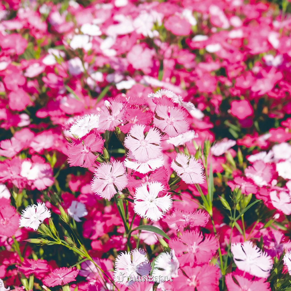 ชื่อสามัญเรียก Chinese Pink หรือ Indian Pink อยู่ในวงศ์ Caryophyllaceae ชื่อวิทยาศาสตร์ Dianthus chinensis L. & hybrid ไม้ดอกอายุสั้นหรือ 2 ปี สูง 15-20 เซนติเมตร ดอกออกเป็นช่อที่ซอกใบและปลายยอด ช่อละ 5-10 ดอก มีทั้งดอกชั้นเดียวและดอกซ้อน กลีบดอกรูปไข่กลับ ปลายกลีบหยักเป็นแฉกลึก สีขาว ชมพู แดง ม่วง และสองสีในดอกเดียวกัน ชอบแสงแดดเต็มวัน ดินร่วนปนทรายระบายน้ำดี
