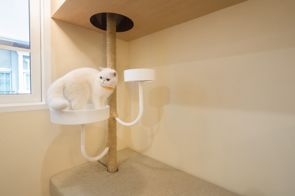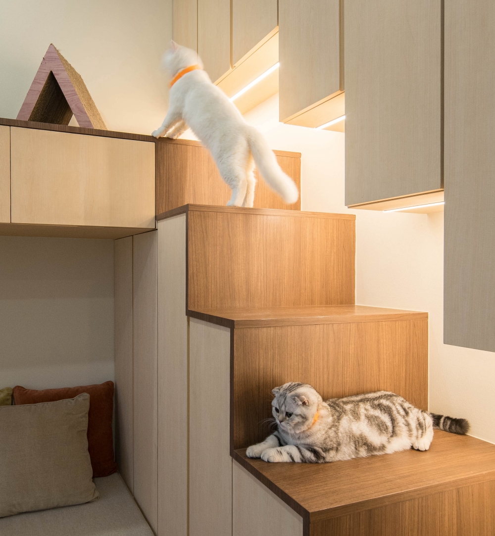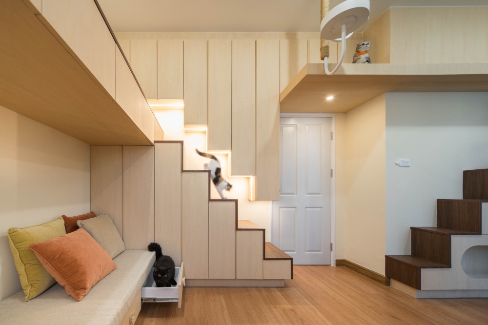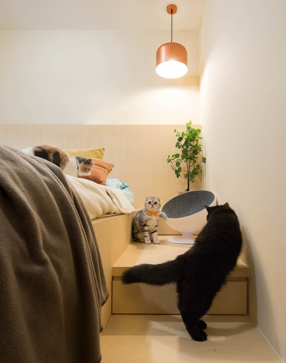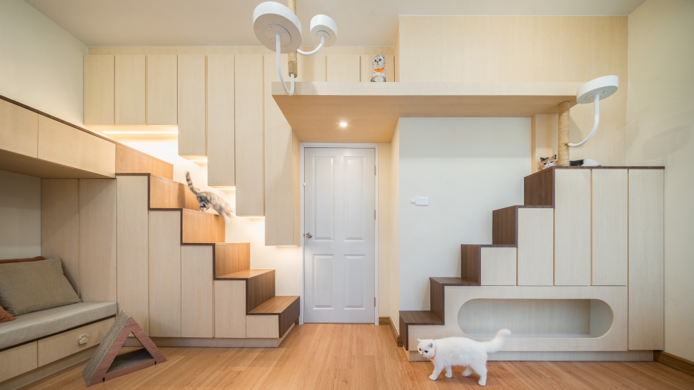 มากฟังก์ชัน ออกแบบพื้นที่เล่นควบรวมไปกับที่นอนแมว โดยผสานเสาฝนเล็บให้เป็นหนึ่งเดียวไปกับชั้นลอยเก็บของซึ่งจริงๆ แล้วเป็นที่ให้น้องๆ ได้ซ่อนตัวและเล่นสนุกในตอนกลางวัน