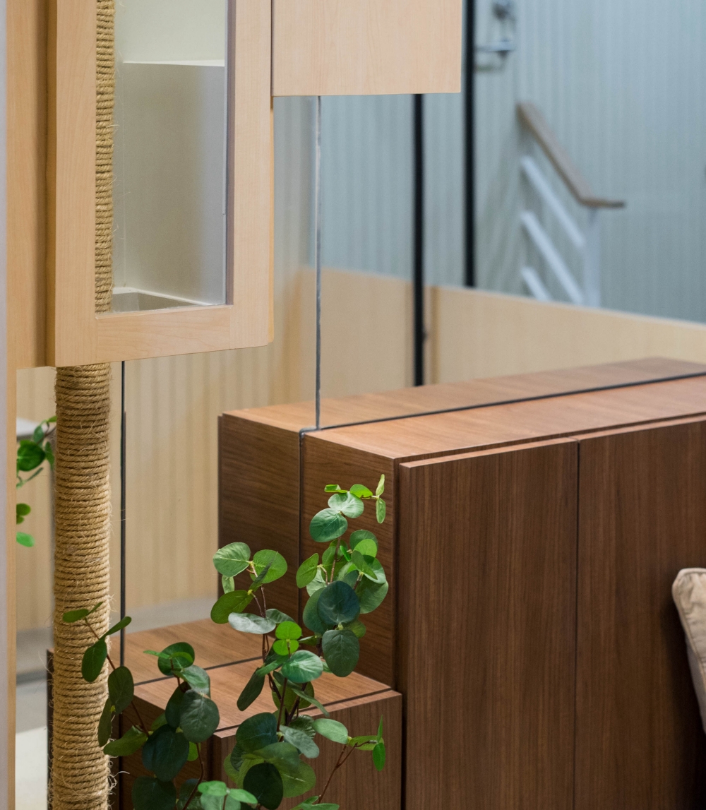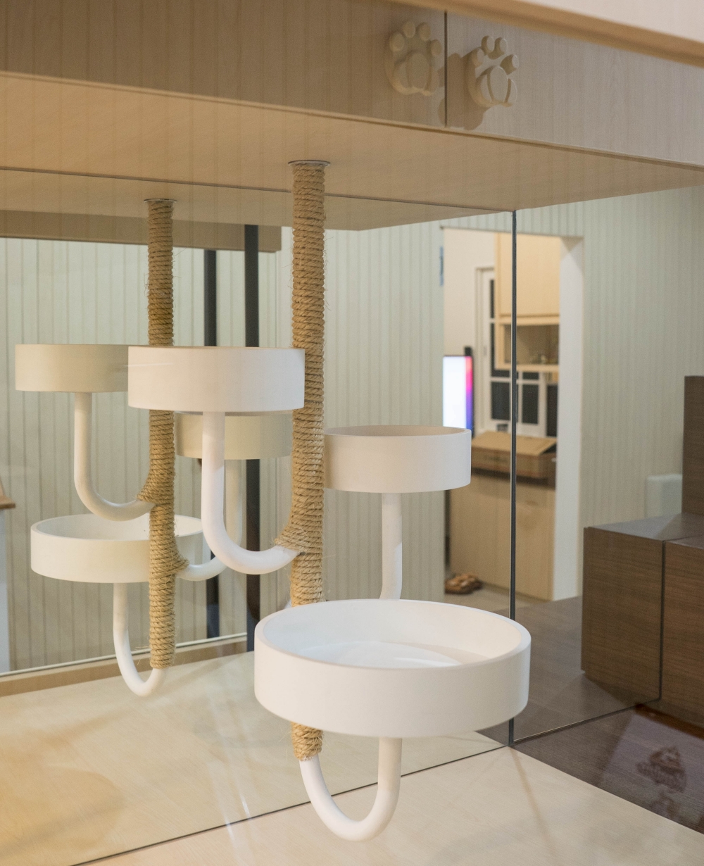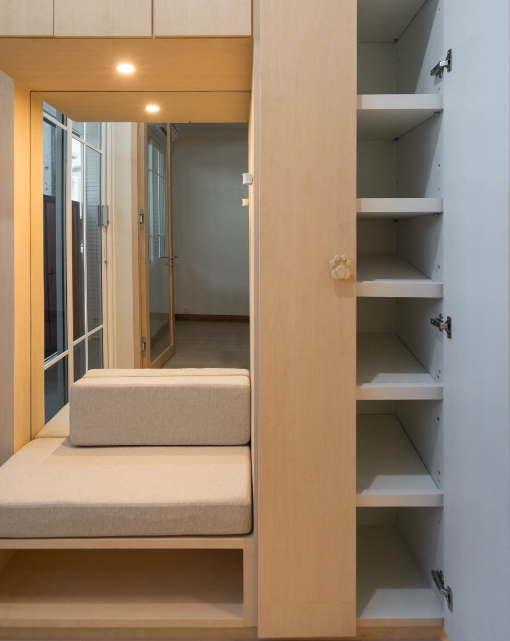 มากฟังก์ชัน ออกแบบพื้นที่เล่นควบรวมไปกับที่นอนแมว โดยผสานเสาฝนเล็บให้เป็นหนึ่งเดียวไปกับชั้นลอยเก็บของซึ่งจริงๆ แล้วเป็นที่ให้น้องๆ ได้ซ่อนตัวและเล่นสนุกในตอนกลางวัน