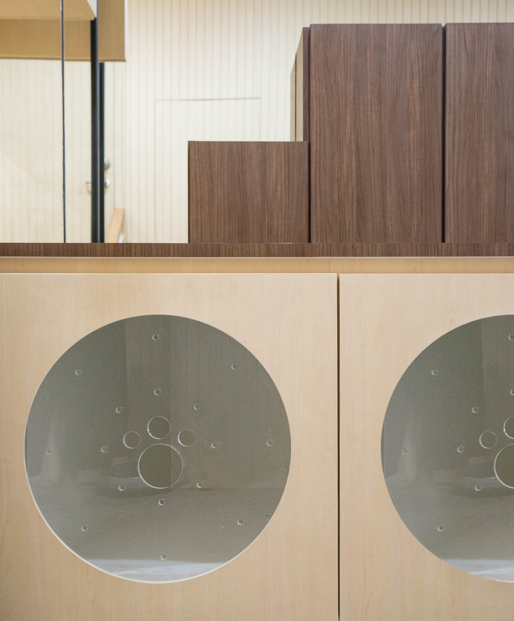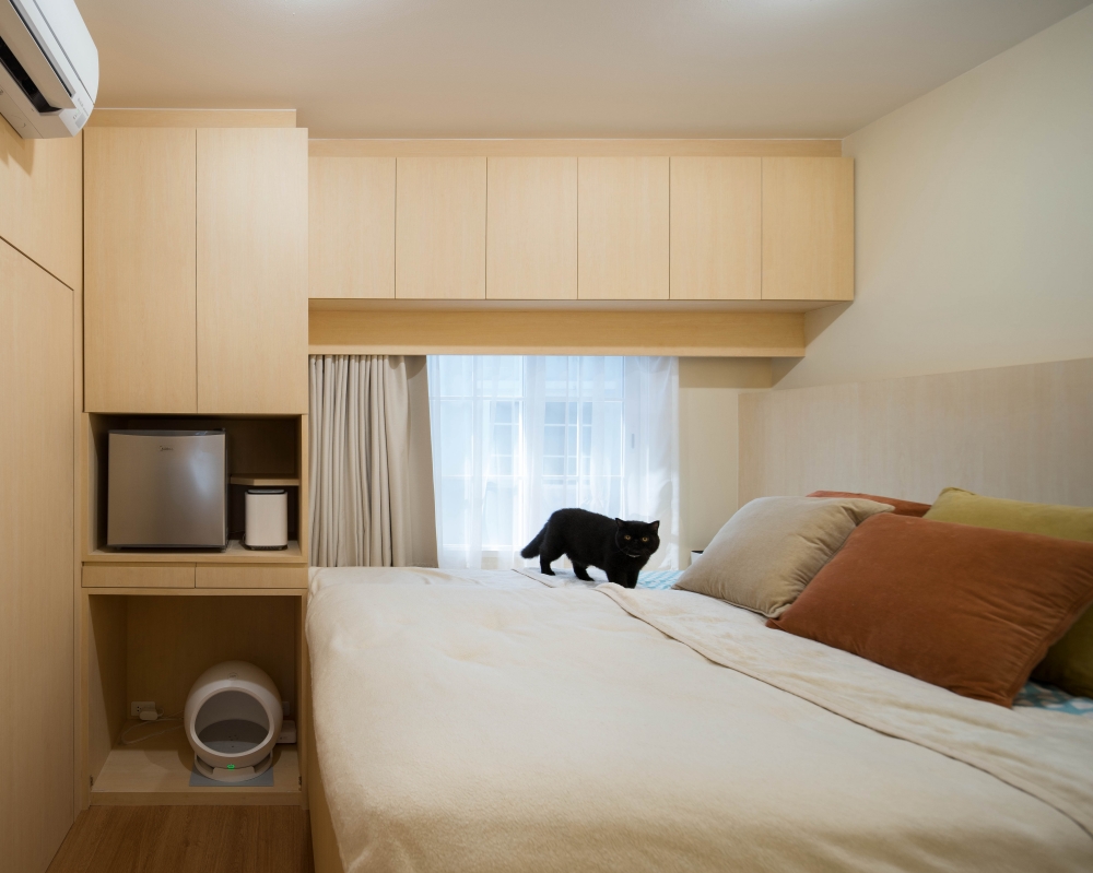 สำหรับพื้นที่ชั้น 2 บรรจุ 2 ห้องนอน 1 ห้องน้ำ ซึ่งคุณเอ้เลือกห้องเล็กเป็นห้องนอนของตัวเอง แล้วยกห้องนอนมาสเตอร์ที่ติดด้านหน้าบ้าน มีหน้าต่างไว้ให้เหล่าเจ้านายได้เพลิดเพลินไปกับการชมวิวซึ่งเจ้านายสามารถเข้า-ออกทุกห้องของพื้นที่ชั้น 2 ผ่านประตูแมวเล็กที่ซ้อนไว้กับบานประตู ส่วนภายในห้องนอนใหญ่เนรมิตเป็นพื้นที่สำหรับแมวอย่างเต็มรูปแบบไม่ว่าจะเป็นที่ฝนเล็บ ที่กระโดดปีนป่าย ที่ซ่อนตัว ที่ถ่ายอุจจาระแบบอัตโนมัติซึ่งสามารถเก็บข้อมูลของน้องๆ แต่ละตัวได้อย่างชาญฉลาด และพื้นที่สำคัญที่ใช้เวลามากที่สุดในแต่ละวันอย่างที่นอน ซึ่งสเปซทั้งหมดออกแบบโดยคำนึงถึงลักษณะนิสัย พฤติกรรม และสัดส่วนของแมวเป็นหลัก เพื่อเอื้อให้เจ้านายได้มีสุขอนามัยที่ดี