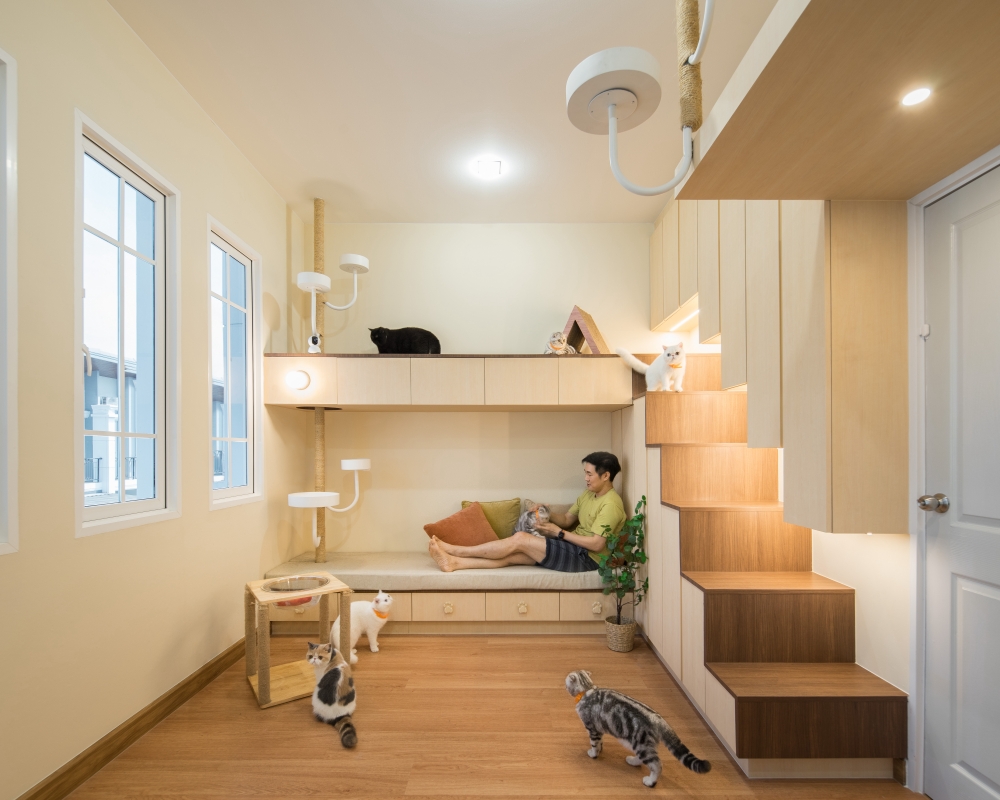 เหตุเกิดจากความเหงาในช่วงของสถานการณ์การระบาดของโควิด-19 ใหม่ๆ ทำให้คุณเอ้ที่หลงรักน้องแมวอยู่แล้วเป็นทุนเดิมตัดสินใจเปลี่ยนจากที่พักอาศัยแบบคอนโดมิเนียมมาซื้อทาวน์เฮ้าส์ในโครงการโกลเด้นทาวน์ ย่านแบริ่งแทน แล้วปรับเปลี่ยนพื้นที่ให้สามารถรองรับการเลี้ยงแมวได้อย่างเต็มประสิทธิภาพ โดยมีโจทย์ให้ทางทีมออกแบบว่า “อยากได้บ้านคนที่น้องแมวอยู่ร่วมกับเราแล้วแฮปปี้”