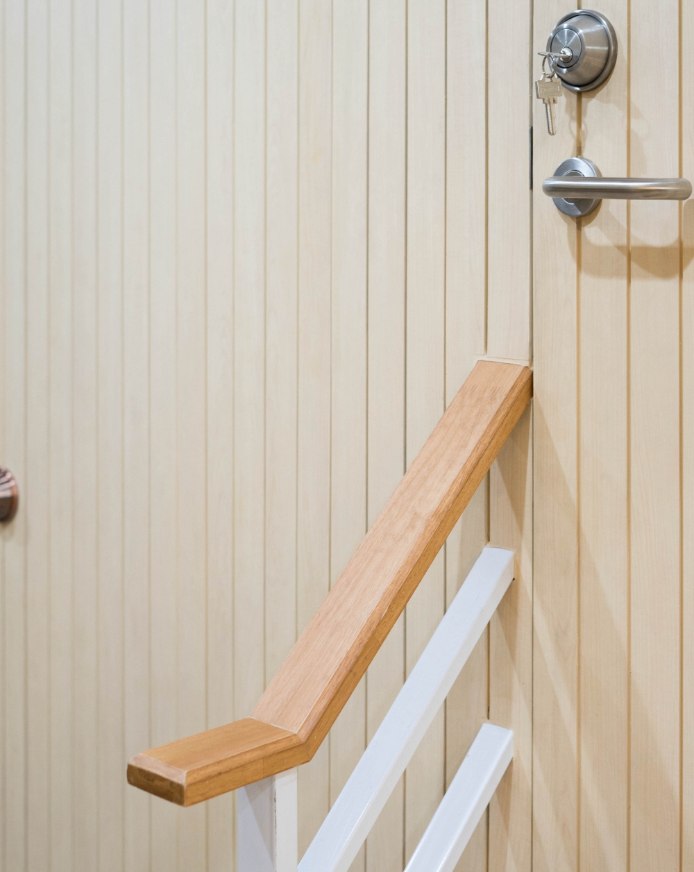 ที่ซ่อนบันได เพิ่มกิมมิกให้บ้านด้วยบันไดทางขึ้นชั้น 2 ที่ปิดกั้นไว้ด้วยประตูลับซึ่งตกแต่งให้ดูแนบเนียนไปกับผนังบ้าน มีเพียงราวบันไดบางส่วนที่ยื่นออกมาให้เห็น ทำให้ดูเผินๆ คล้ายกับบ้านนี้ไม่มีบันได![]()