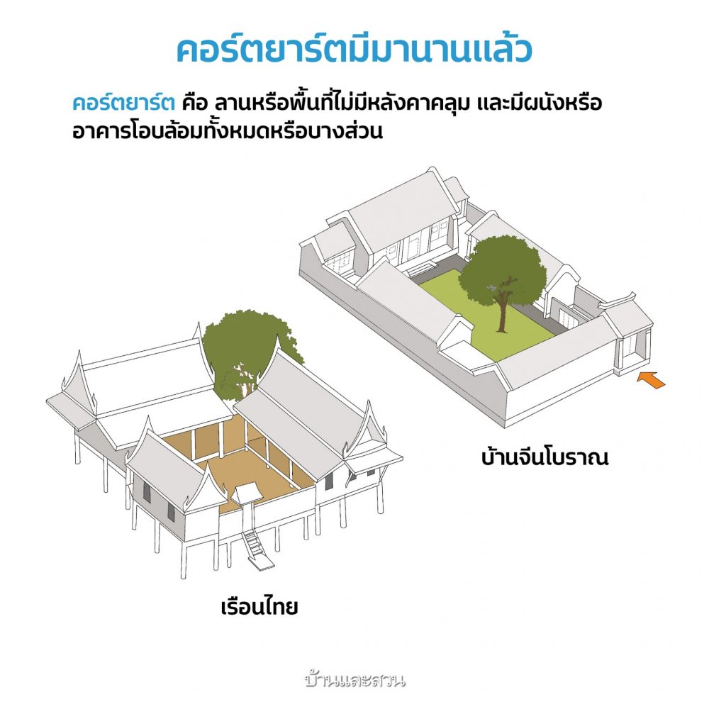 - คอร์ตที่มองด้านเดียว เป็นพื้นที่ระหว่างอาคารกับผนัง อาจออกแบบให้ชั้นบนยื่นออกมาเพื่อคลุมพื้นที่ด้านล่างให้มีลักษณะแบบกึ่งกลางแจ้ง (Semi-outdoor space) ซึ่งใช้งานได้โดยไม่เปียกฝน