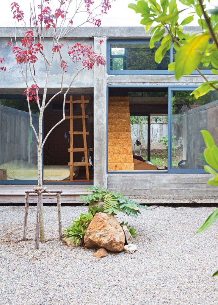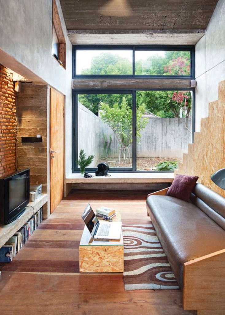 บ้านปูนเปลือย หลังนี้ เป็นบ้านที่คิดถึงสิ่งแวดล้อมและการประหยัดพลังงานในระดับแพลตทินัม ที่ปรับปรุงจากอาคารหลังเดิมที่มีอายุกว่า 60 ปี ให้เป็นบ้านหลังใหม่ โดยใช้วัสดุของเดิมที่รื้อถอนอย่างระมัดระวัง ก้อนอิฐบางส่วนจากบ้านเก่า กลายมาเป็นผนังอิฐโชว์สุดเท่ ที่มีลูกเล่นการเว้นช่องระบายอากาศที่น่าสนใจ บ้านหลังนี้ใช้วัสดุที่เผยให้เห็นเนื้อจริงของวัสดุ โดยไม่มีการทาทับ เช่น ผิวคอนกรีตเปลือย ไม้ หรือ อิฐก่อโชว์แนว
