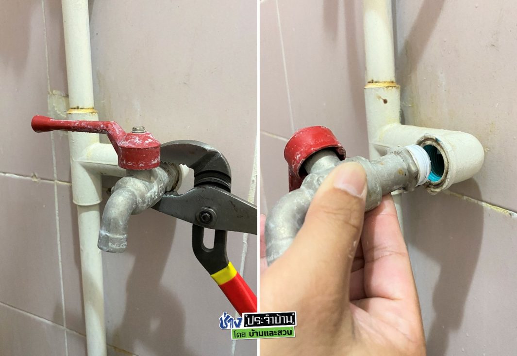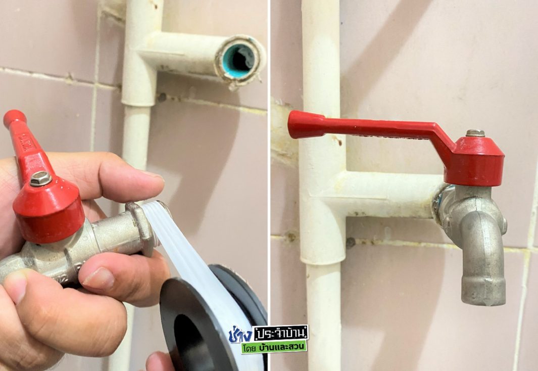 5. นำก๊อกน้ำมาพันเทปพันเกลียวแล้วใส่กลับคืนที่เดิม แล้วทดสอบการรั่วซึมต่างๆอีกครั้งให้เรียบร้อย