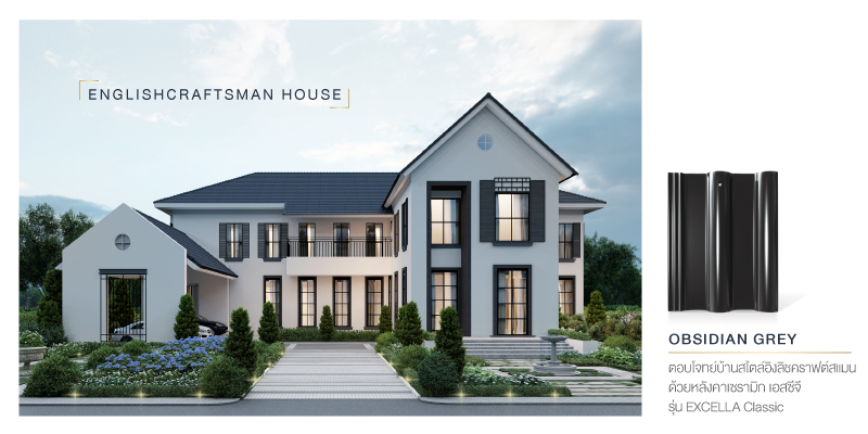 กระเบื้องหลังคาที่เหมาะกับบ้านแบบ English Craftsman House ควรใช้กระเบื้องหลังคา EXCELLA รุ่น Modern และ Grace คล้ายกับบ้านแบบ Modern English Cottage เนื่องจากแบบบ้านทั้งสองรูปแบบนี้ได้รับอิทธิพลมาจากทวีปยุโรปเหมือนกัน ดังนั้นการใช้รูปทรงของแผ่นกระเบื้องจึงมีสไตล์คล้ายคลึงกัน ทั้งนี้ สีที่เหมาะสมสามารถใช้ได้ทุกเฉดสีตามความชอบ ไม่ว่าจะเป็นโทนสว่างหรือโทนมืด อย่างหลังคาเซรามิก เอสซีจี รุ่น EXCELLA Classic สี Obsidian Grey