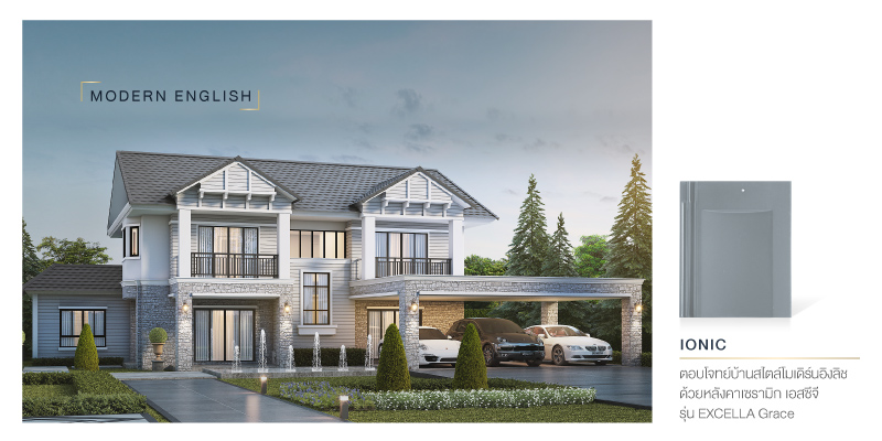บ้านแบบ Modern English Cottage เหมาะกับหลังคา EXCELLA รุ่น Modern และ Grace ที่มีความสูงลอนไม่มากนัก หรือเป็นแผ่นเรียบไปเลยก็ได้ ซึ่งจะให้ความเรียบหรู ดู สีที่ใช้แนะนำเป็นโทนสีเทา, น้ำเงิน และเขียวเข้ม อย่างหลังคาเซรามิก เอสซีจี รุ่น EXCELLA Grace สี Ionic