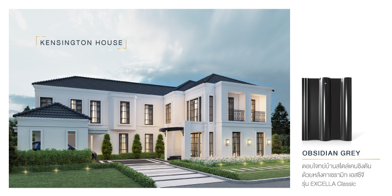 หลังคาของบ้านแบบ Kensington House เหมาะกับ EXCELLA ทุกรุ่น ไม่ว่าจะทรงเรียบหรือทรงลอนก็เข้ากันดี โดยหลังคากลุ่มโทนสีน้ำเงิน สีเทาเข้ม หรือสีดำ อย่างหลังคาเซรามิก เอสซีจี รุ่น EXCELLA Modern สี Obsidian Grey จะช่วยส่งเสริมภาพลักษณ์ทำให้บ้านดูหรูหราและอบอุ่นขึ้นเป็นเท่าตัว