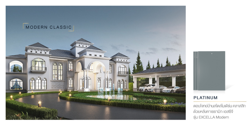 กระเบื้องหลังคาที่เหมาะสำหรับบ้านแบบ Modern Classic คือ กระเบื้องหลังคา EXCELLA รุ่นคลาสสิกอย่าง รุ่น Modern และ Grace ควรเลือกใช้สีโทนสว่างเข้ากันดีกับตัวบ้านสีขาว เพิ่มความความเรียบหรู มีระดับ อย่างหลังคาเซรามิก เอสซีจี รุ่น EXCELLA Modern สี Platinum