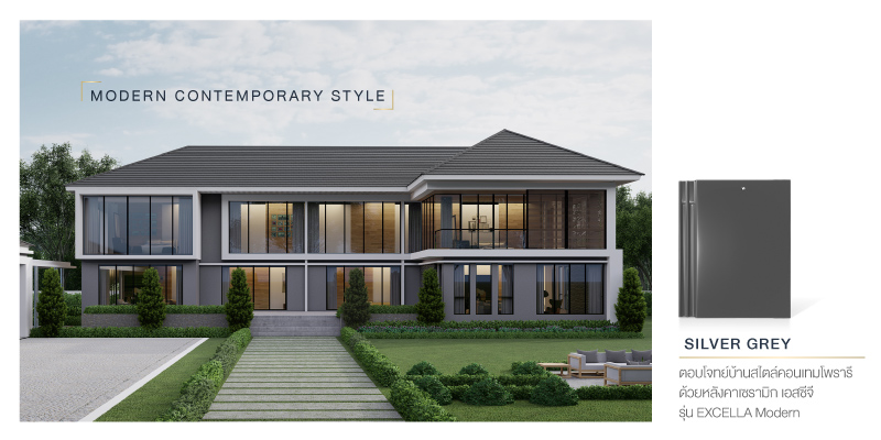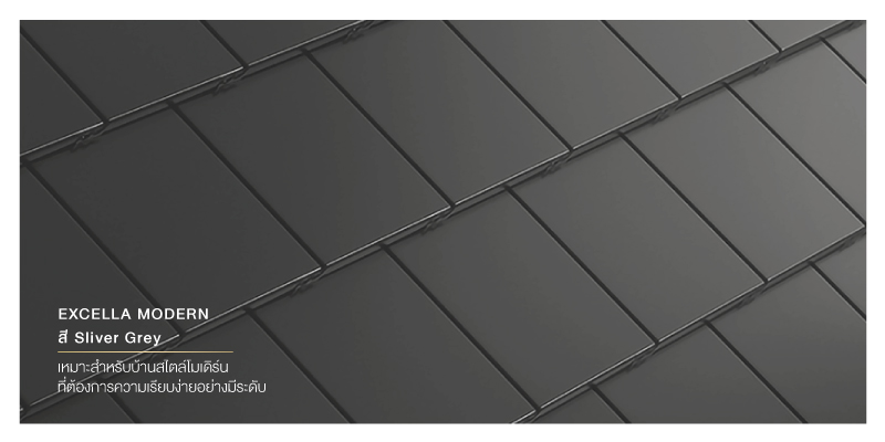 กระเบื้องหลังคาที่เหมาะกับแบบบ้าน Modern Contemporary คือกระเบื้องหลังคา EXCELLA รุ่น Grace และ Modern เน้นการใช้โทนสีที่คล้ายคลึงกัน ทั้งโทนสว่างและเอิร์ธโทน สามารถเลือกใช้ได้ทุกโทนสี อย่างหลังคาเซรามิก เอสซีจี รุ่น EXCELLA Modern สี Silver Grey