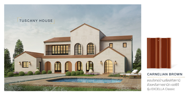 ส่วนหลังคาของบ้าน Tuscany House จะเหมาะกับหลังคา EXCELLA รุ่น Classic ให้รูปทรงลอนจะเข้ากับตัวบ้านมากที่สุด เน้นไล่ระดับกันให้ดูมีมิติ และควรเน้นโทนอบอุ่น เช่น สีน้ำตาล สีส้ม สีแดง หรือสีเหลือง อย่างหลังคาเซรามิก เอสซีจี รุ่น EXCELLA Classic สี Carnelian Brown ให้ความรู้สึกอบอุ่น เข้ากับโทนสีของตัวบ้าน
