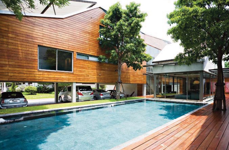 บ้านรูปทรงแปลกตาขนาด 1,000 ตารางเมตรหลังนี้แบ่งได้เป็นสามส่วนหลักๆ ส่วนแรกคือตำแหน่งตรงกลางพื้นที่เป็นสระว่ายน้ำและพื้นที่ส่วนกลางซึ่ง เปรียบเหมือนกองบัญชาการของบ้าน ประกอบด้วยส่วนนั่งเล่น ส่วนรับประทานอาหาร และครัวฝรั่ง สำหรับเป็นที่ที่สมาชิกทุกคนจะได้ทำกิจกรรมร่วมกัน คุณช้างเล่าถึงการใช้งานพื้นที่ส่วนนี้ว่า