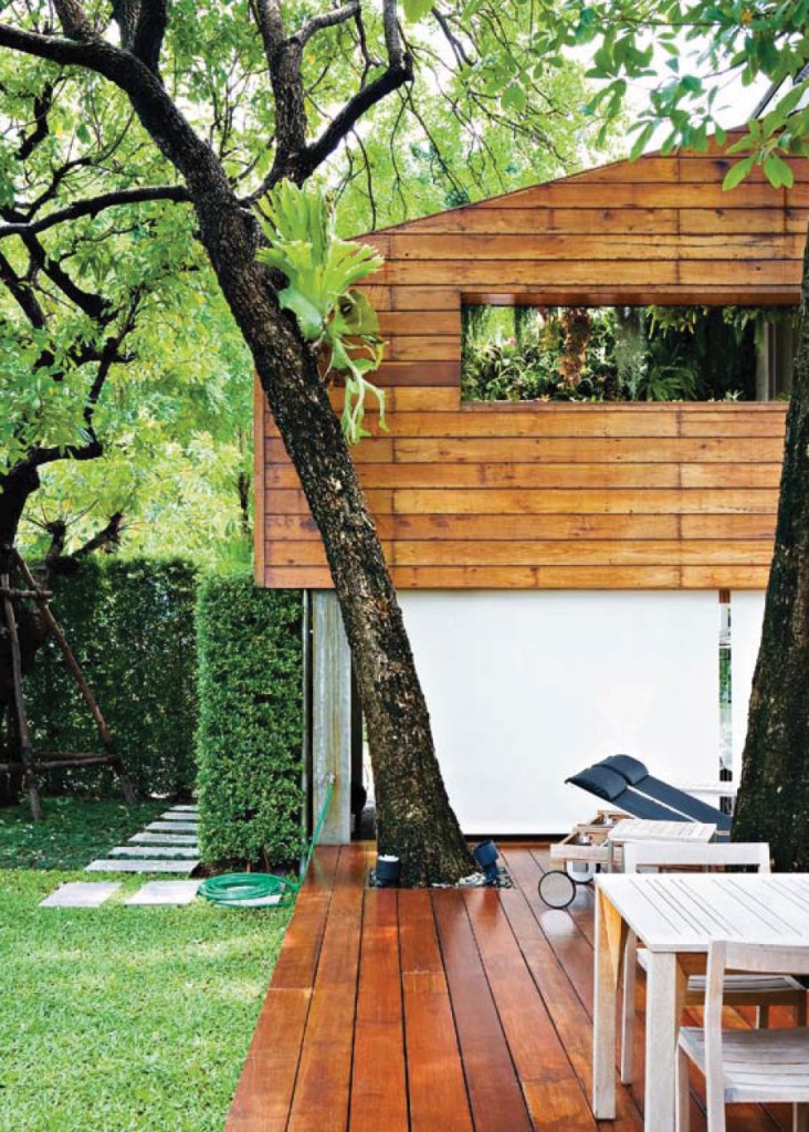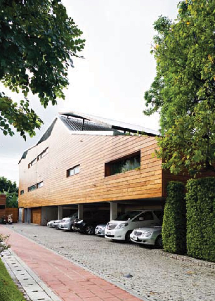 “เราผสมผสานวัสดุดั้งเดิมอย่างไม้เข้ากับรูป ทรงเรขาคณิตของบ้าน เพื่อให้ดูน่าสนใจครับ ไม้ที่นำมาใช้ส่วนใหญ่รื้อมาจากบ้านหลังเก่า ช่วยประหยัดงบประมาณและทรัพยากรธรรมชาติด้วยครับ ส่วนที่เหลืออีกนิดหน่อยก็หาไม่ยาก เพราะที่บ้านทำธุรกิจเกี่ยวกับไม้อยู่ด้วยครับ”