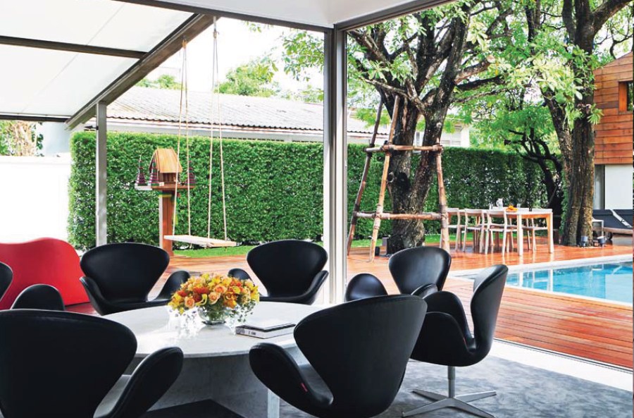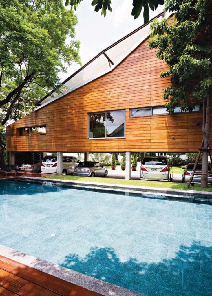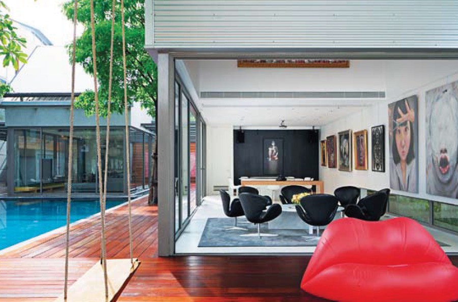 บ้านรูปทรงแปลกตาขนาด 1,000 ตารางเมตรหลังนี้แบ่งได้เป็นสามส่วนหลักๆ ส่วนแรกคือตำแหน่งตรงกลางพื้นที่เป็นสระว่ายน้ำและพื้นที่ส่วนกลางซึ่ง เปรียบเหมือนกองบัญชาการของบ้าน ประกอบด้วยส่วนนั่งเล่น ส่วนรับประทานอาหาร และครัวฝรั่ง สำหรับเป็นที่ที่สมาชิกทุกคนจะได้ทำกิจกรรมร่วมกัน คุณช้างเล่าถึงการใช้งานพื้นที่ส่วนนี้ว่า